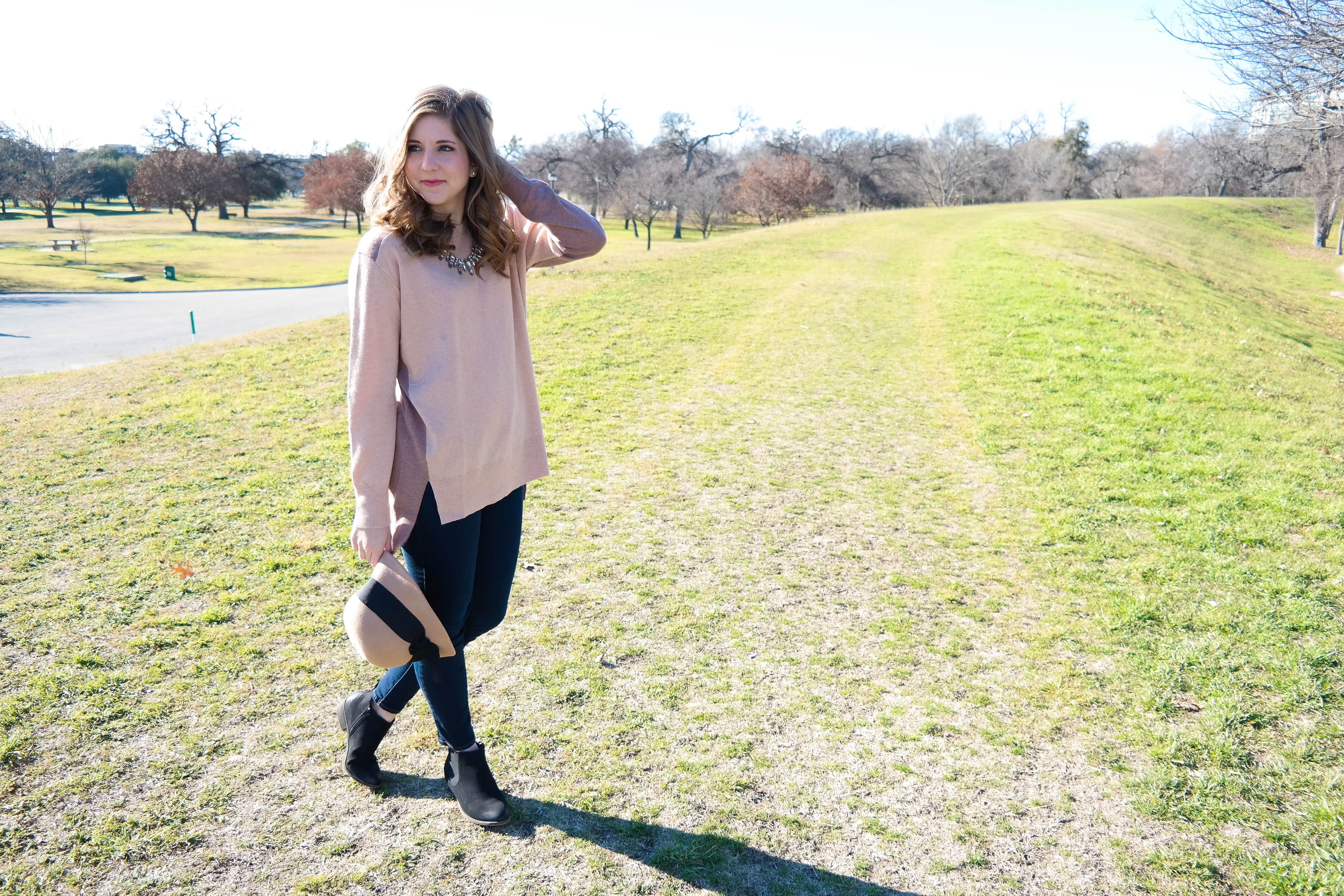 I’m not typically a hat person but for some reason, this hat just clicks with me. I didn’t want to be too daring so I just played a little safe by keeping everything in the same color palette. With everything the hat being blush and black tones it was super easy to throw an outfit together.