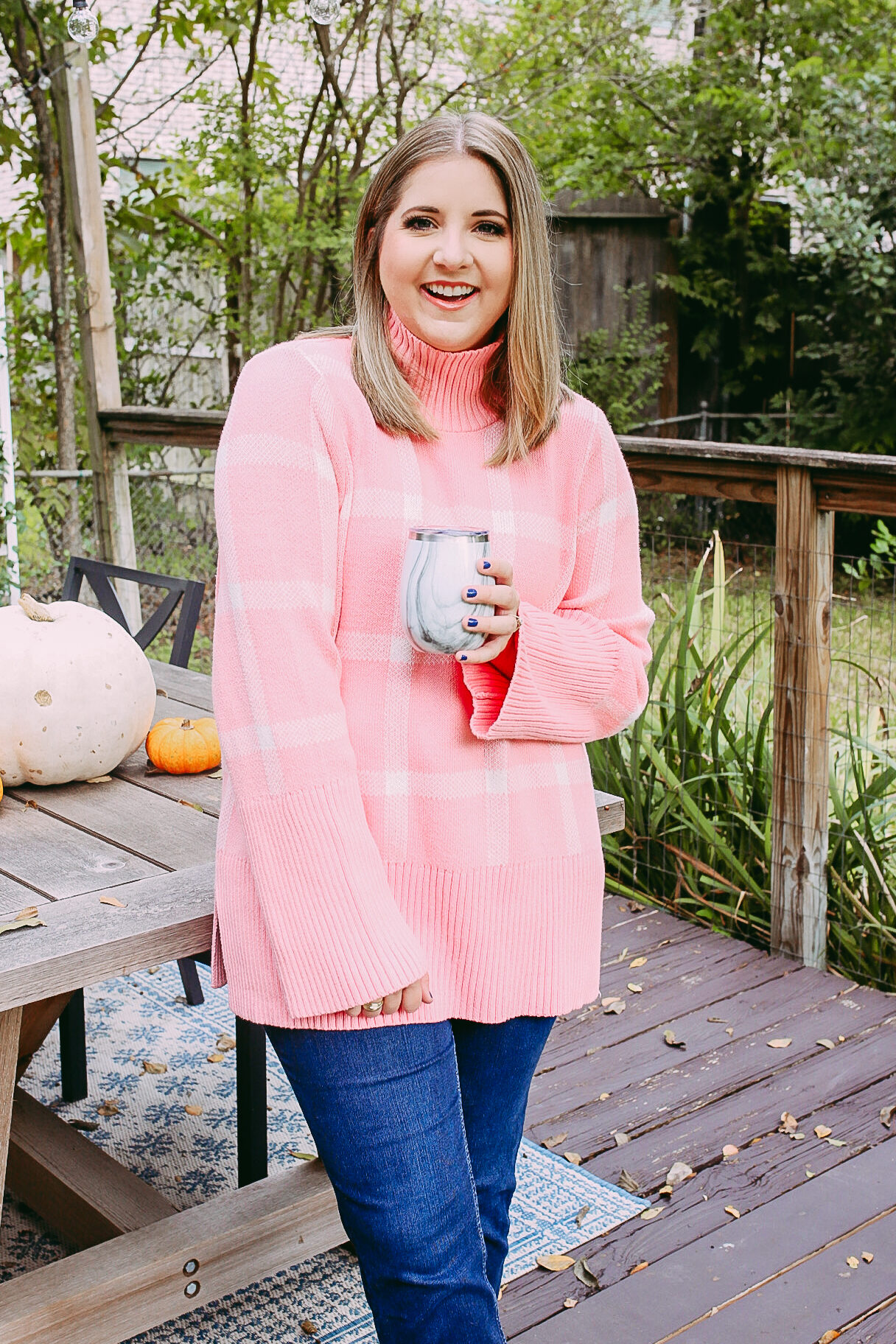 This pink tunic-style sweater with bell sleeves is such a fun pop of color and is perfect for winter. I sized up for an oversized look but if you wanted it more fitted or true to size I recommend getting your normal size. This sweater looks great with jeans but would also be really cute with leggings for the perfect comfy Thanksgiving look.