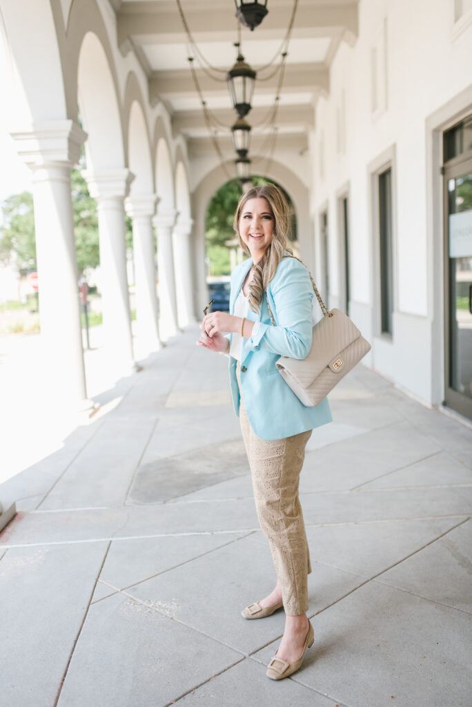 Because these pants are a great neutral base, I keep the whole look simple and neutral and then added a pop of color with this blue linen blazer. Blazer can be really hot and not great for summer but in a lightweight fabric like linen along with the fun color, it’s a great option. It can also be versatile in your closet.
