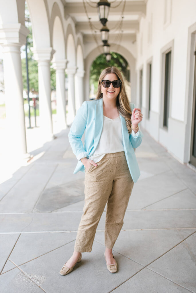 For this next look, I also leaned into the khaki color pant for a summer workwear look but with a fun twist of this beautiful eyelet fabric. Finding a fabric like eyelet, which is a traditional summer fabric, in a workwear piece is the perfect way to blend the two.