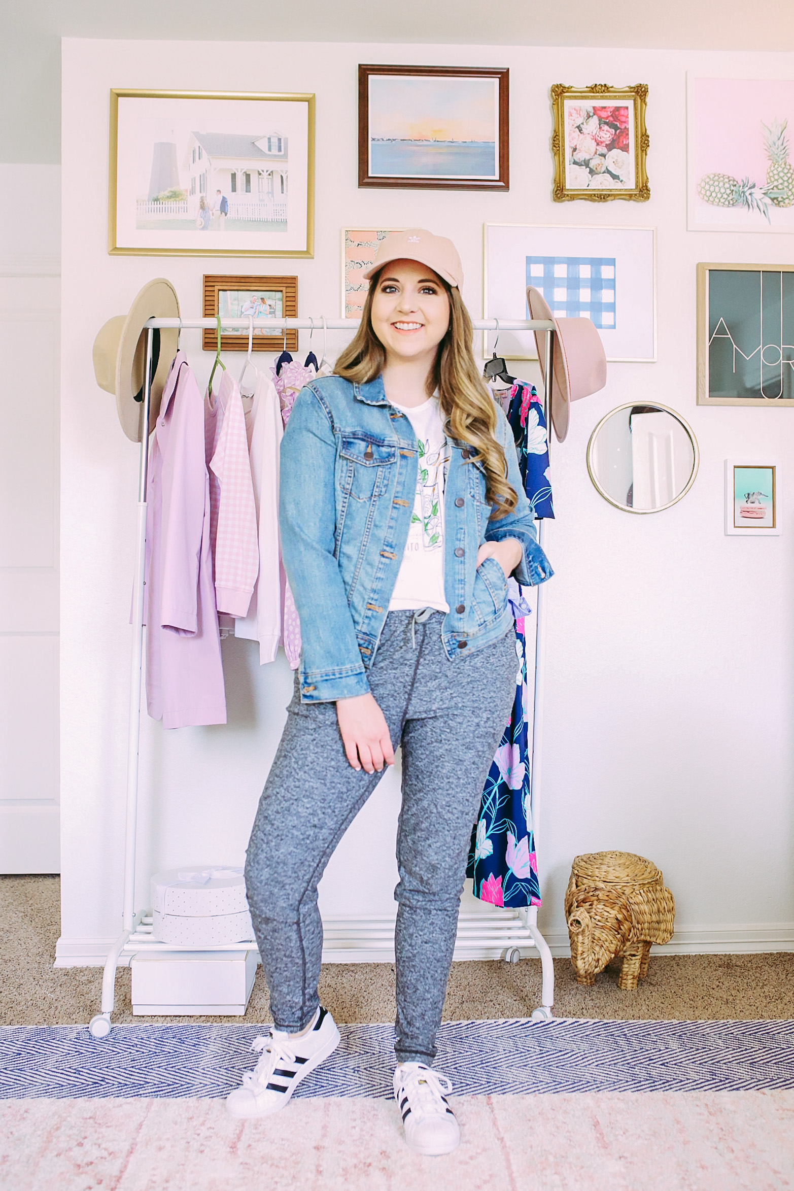 This look is definitely quarantine approved. It’s super casual and definitely comfy but you still look put together. Just simply add a front tuck into your favorite joggers, throw on a well loved-denim jacket and a hat and you are good to go. You can run to the grocery store or watch Netflix