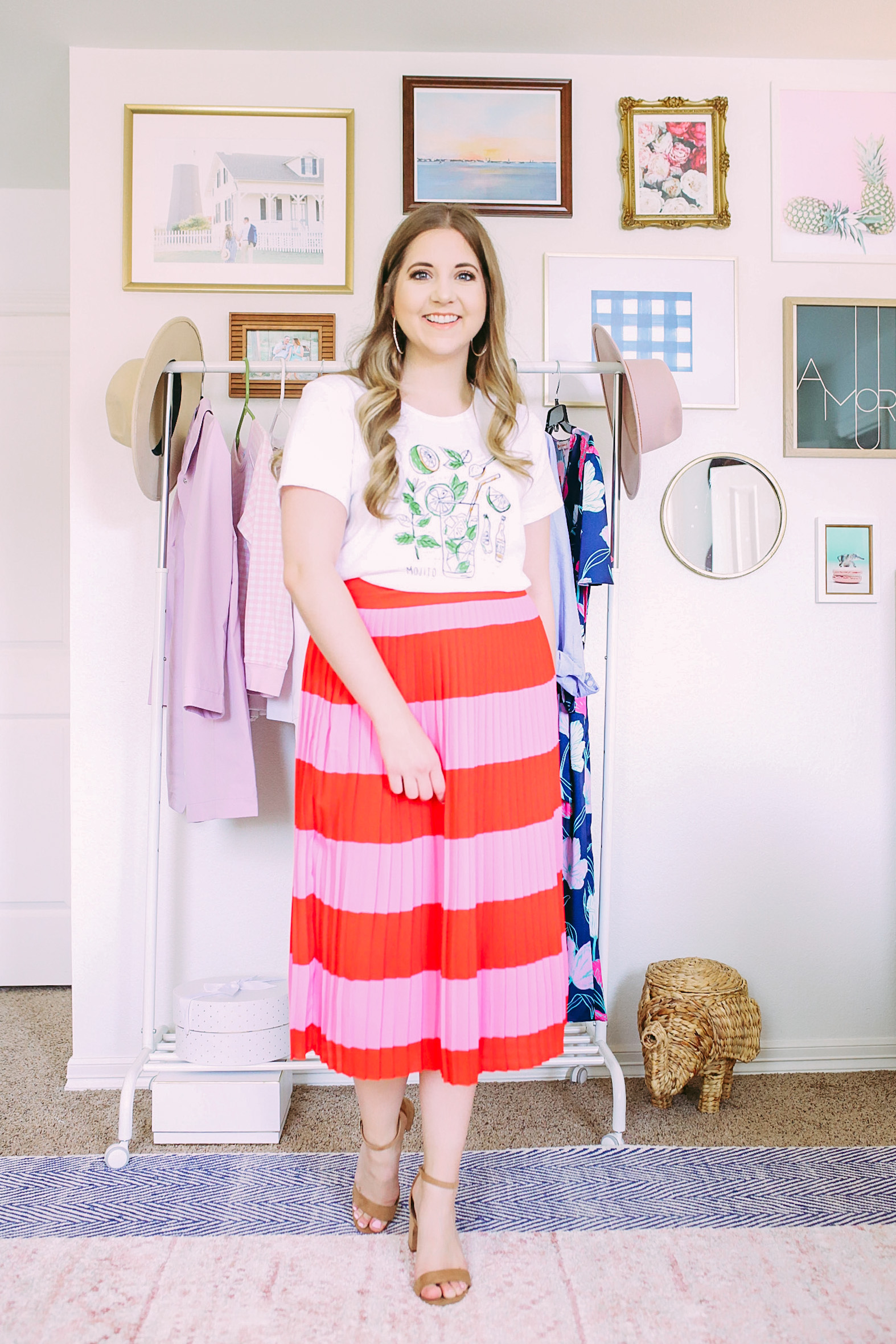 Going back to print mixing, this is a great example of mixing to prints. Since the stripes on the skirt are so large the smaller pattern of the graphic tee isn’t too overwhelming. And even though the colors don’t match they complement each other nicely and pair well together.