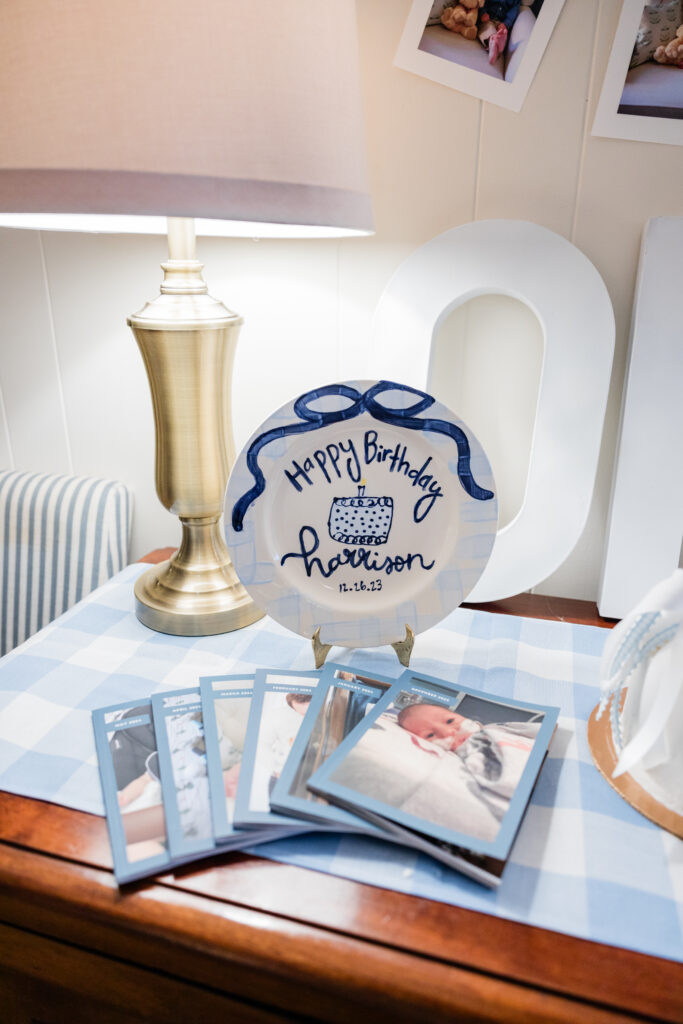 - Personalized High Chair – Add a custom gingham high chair banner with “ONE” in embroidered letters for the perfect smash cake moment.
