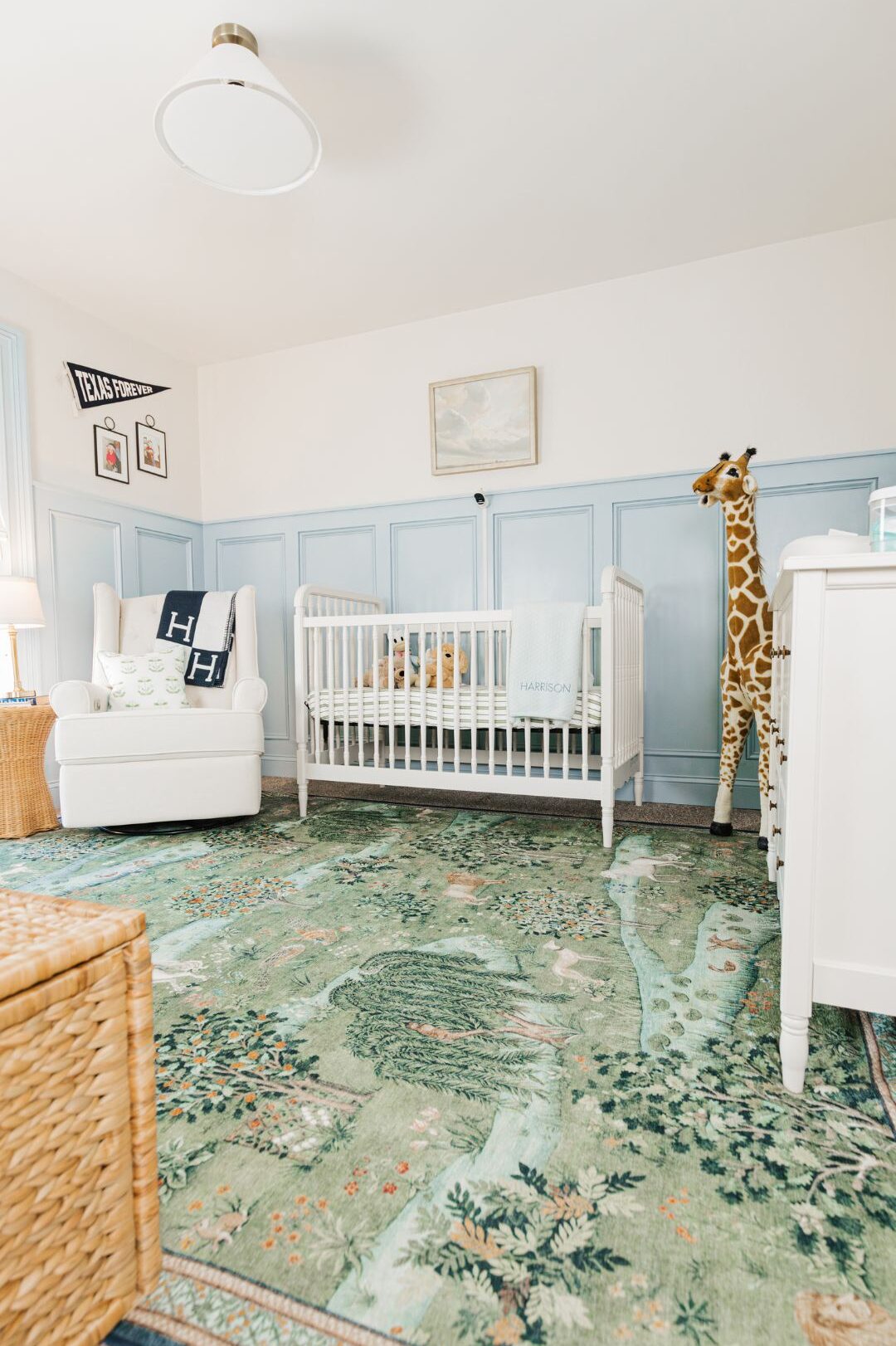 To pull together the room, we mixed in pieces we already had like the Texas Forever pennant, horse painting, landscape art, and scallop wicker side table with new pieces the oversized stuffed giraffe, animal rug, toy chest, green diaper pail, and more.