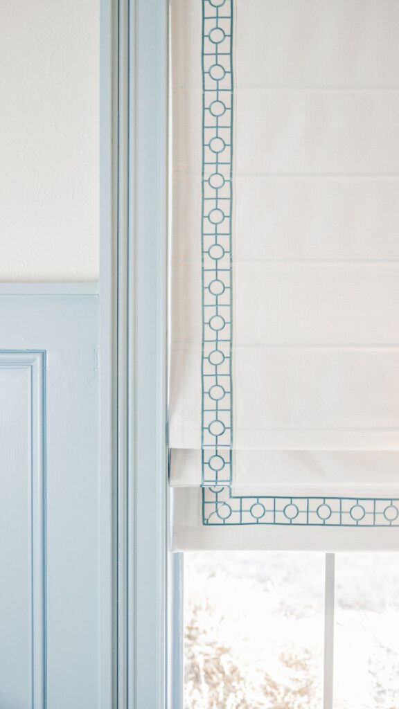 He painted the trim work Serenata AF-535 by Benjamin Moor and the top half of the walls are the same color as the rest of our home. We wanted a mix of blues and greens to add depth to the decor. To highlight the trim work we wanted a window shade to highlight it and not hide like traditional curtain would. Belive it or not, this custom roman shade is from AMAZON! We hunted high and low for an affordable custom roman shade and we took a chance on this Amazon purchase and it turned out better than we could have ever imagined!