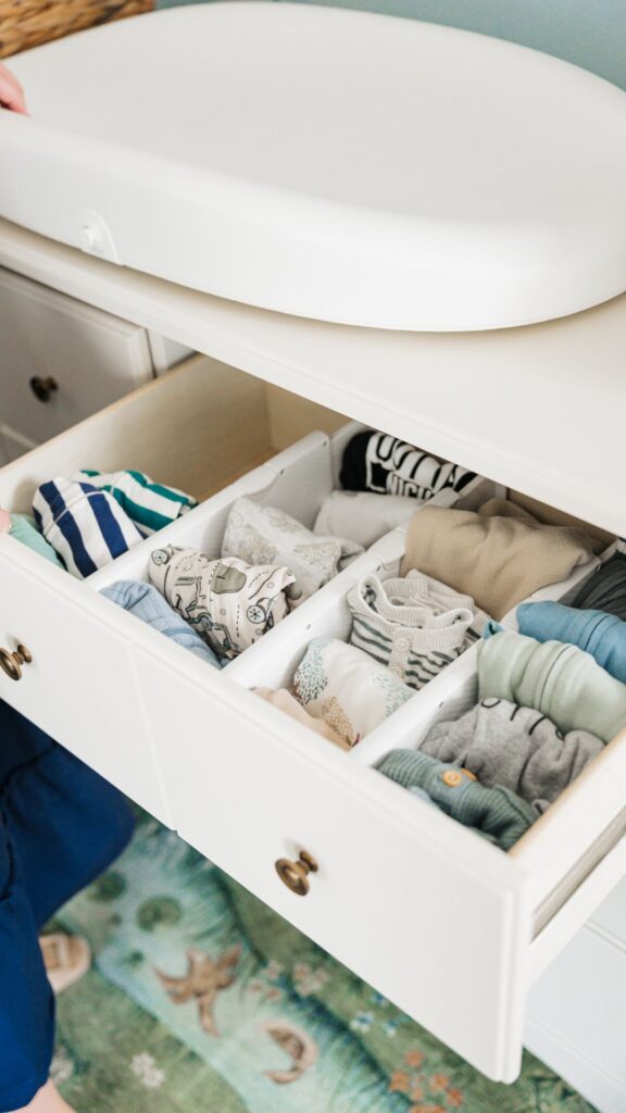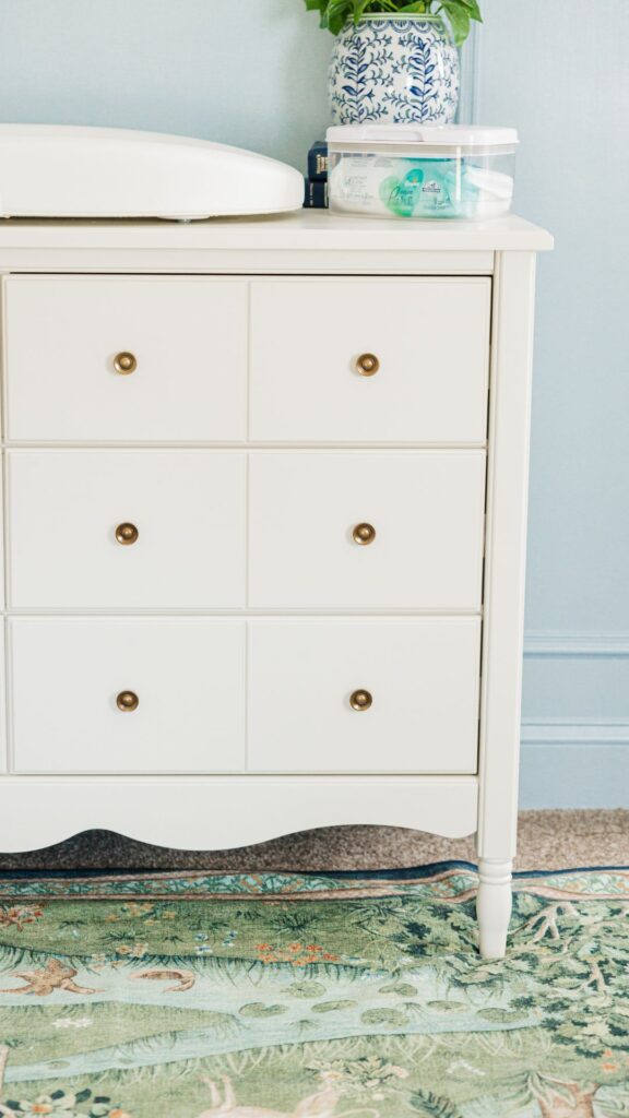 To match the crib we went with the Liberty 6-Drawer Assembled Dresser. This complements the crib perfectly and is the right amount of storage for clothes, diapers, bedding, and more. We added drawer dividers to optimize the space but I love the clean design, simple nobs, and scalloped trim.