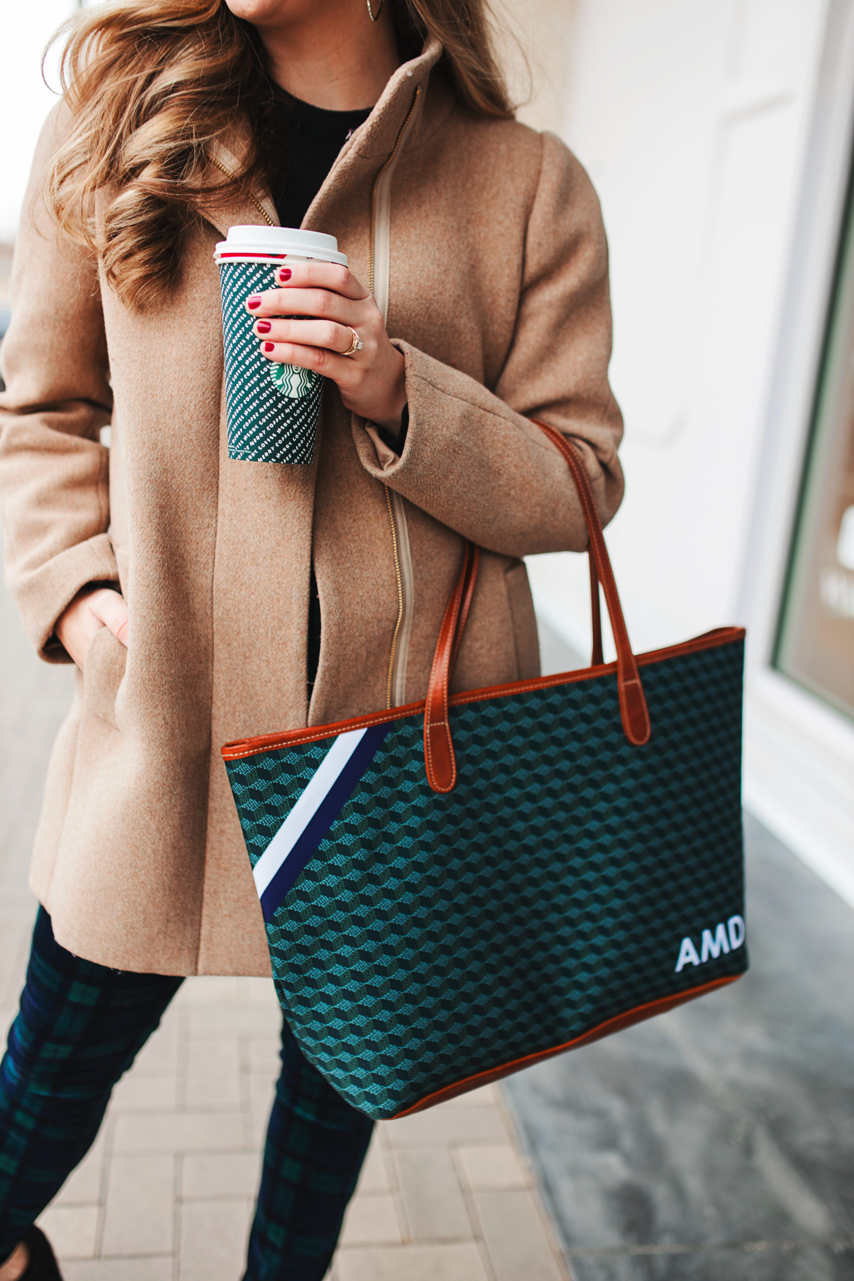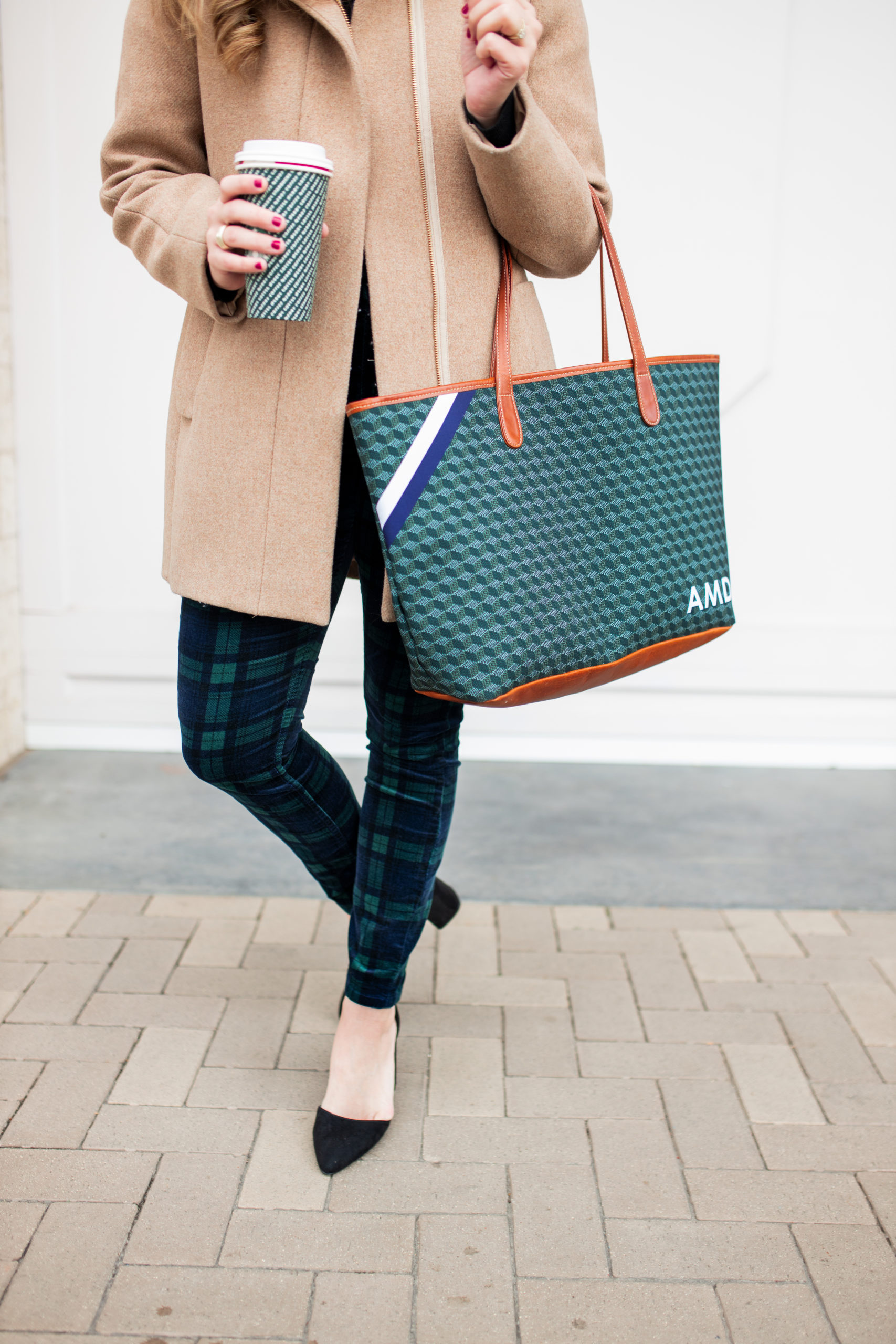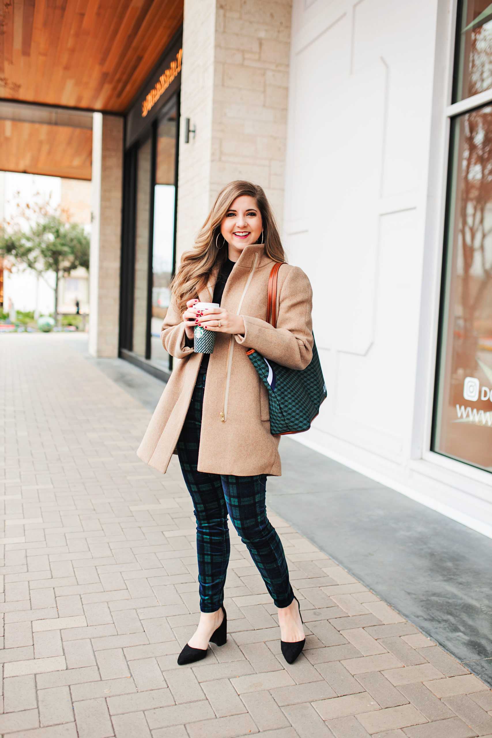 Y’all know I love my Barrington totes and I am a one bag kind of girl, meaning I don’t switch out my bag for every outfit I just grab one and go. Although the pants and the sweater are black, the navy on the bag still complements the outfit nicely and the green just matches perfectly. The large pattern of the plaid and the small pattern of the bag also complement each other nicely, without being too overwhelming or conflicting.