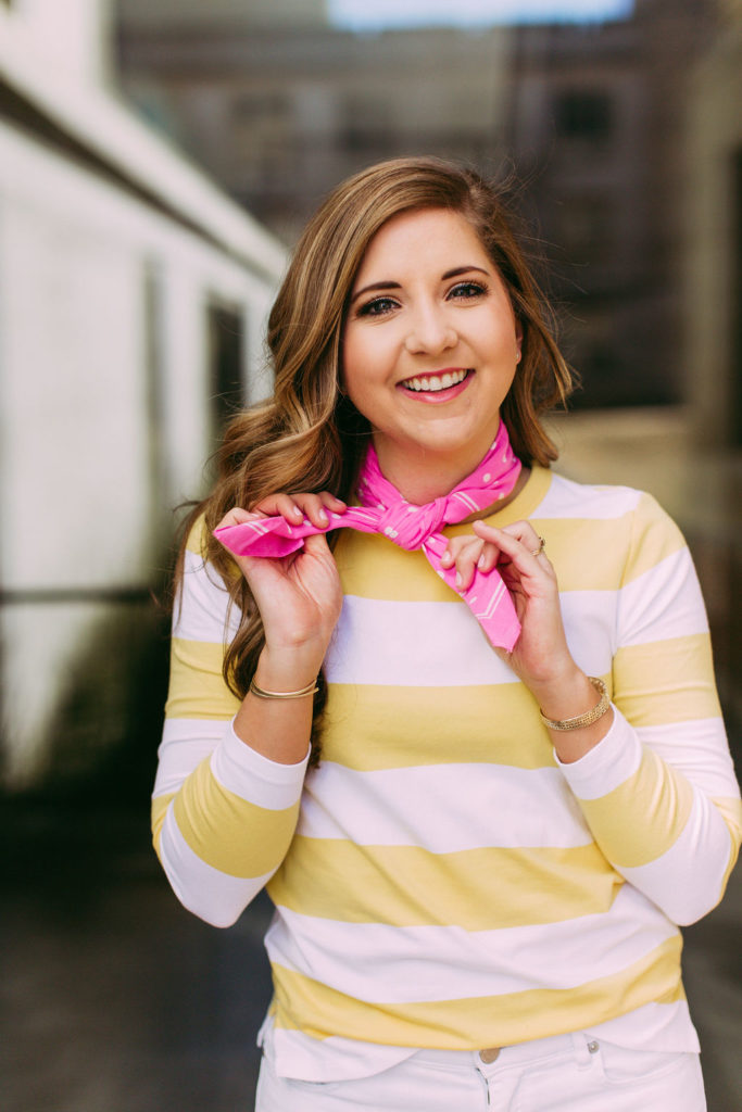 If yellow is an intimidating color for you I recommend putting a different color closest to your face as I did here with a pink bandana. This breaks up the yellow from being right by your hair or face.