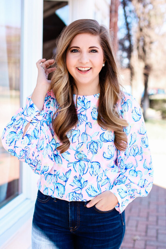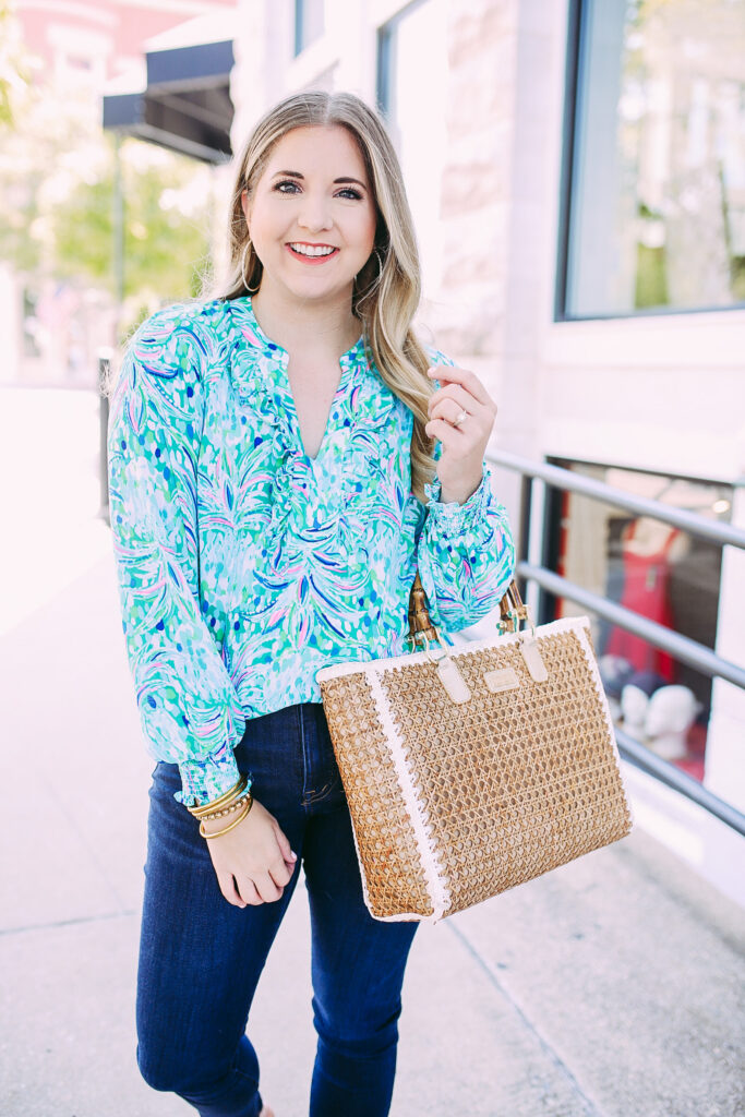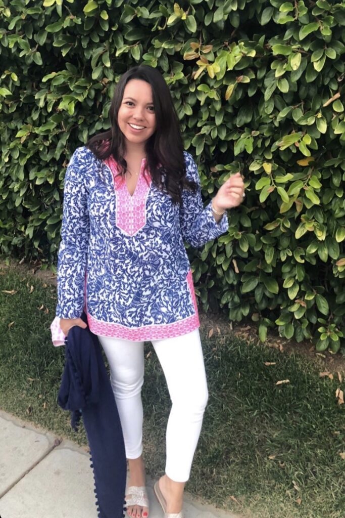 This Elsa top is the holy grail Lilly item, it’s where I recommend everyone to start. It definitely runs on the larger side and has a pretty long hem. I typically half tuck it as I did here, but this top is very versatile and comes in bold Lilly prints but also solids.