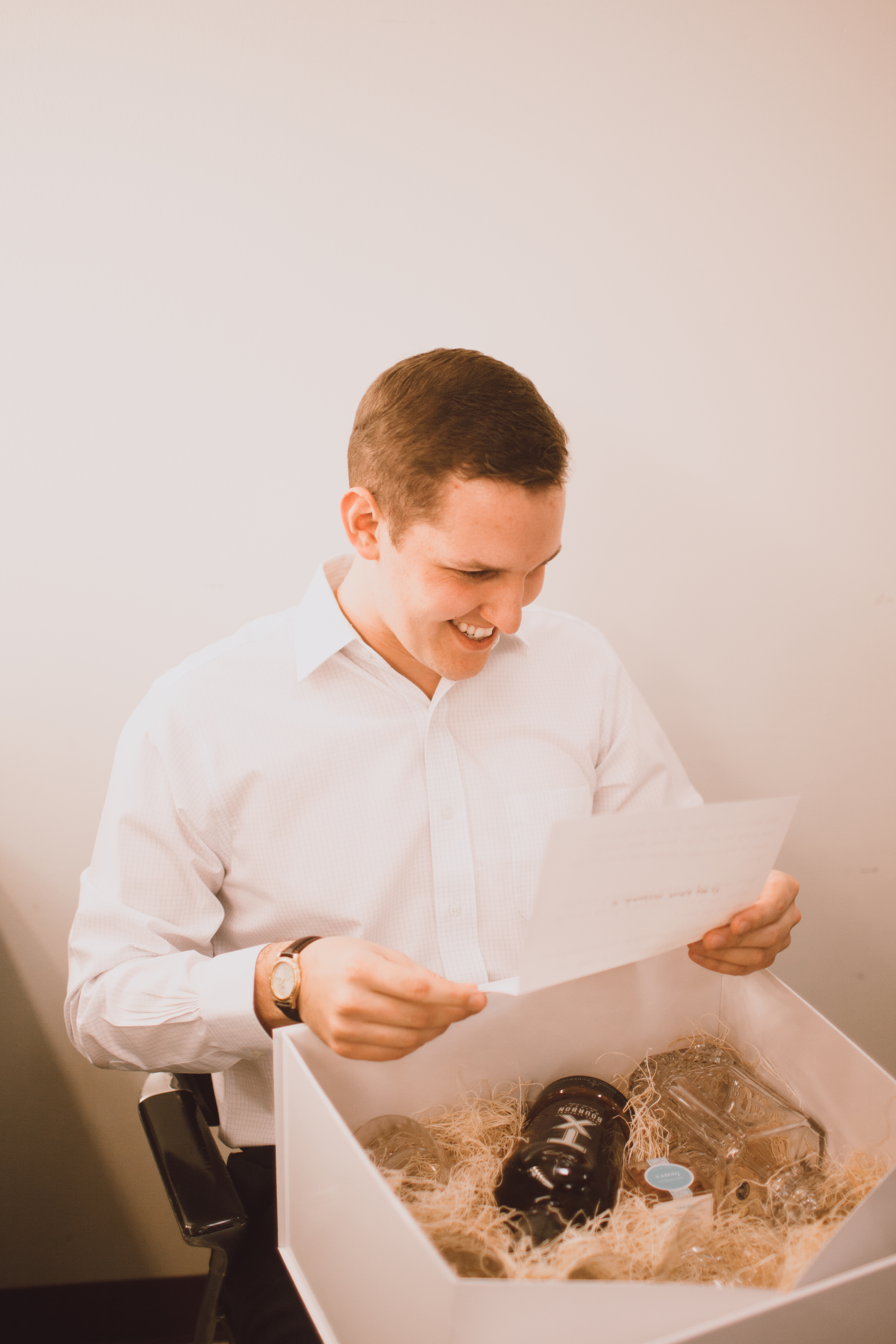 One of my favorite parts of my wedding day was sending Jared his gift. We both decided we were going to get each other something special on our big day. I had my mom go deliver Jared’s gift over to him and had our photographer capture the moment and vice versa.