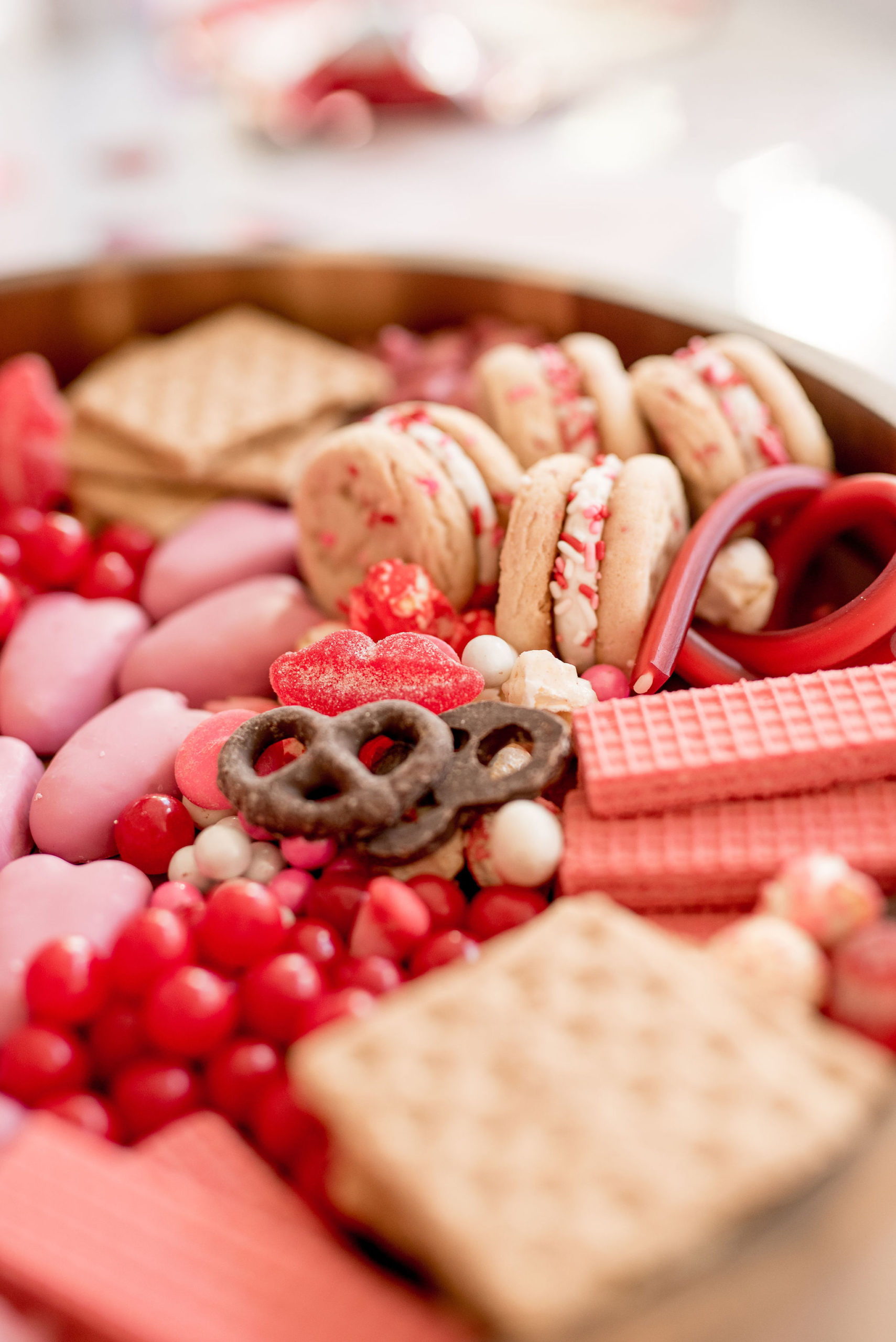 I really have no rhyme or reason when I am assembly a dessert board, but I always start with the biggest pieces, so in the case, I started with the cookie sandwiches and the Reese’s hearts creating the two focal points.