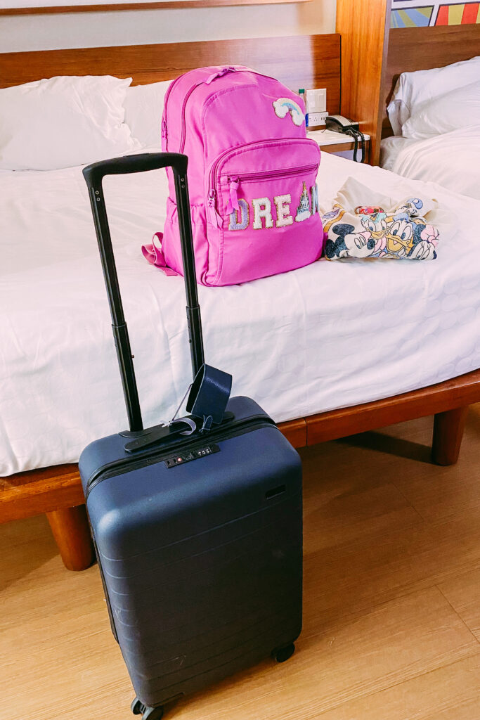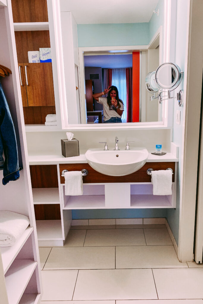 We stayed at Pop Century resort, which is like the cheapest of the cheap for all Disney resorts. In my opinion, we only sleep there so we don’t need it to be fancy. These rooms are small and great for 2-3 people, but anything more is a tight squeeze. There’s typically one queen bed with a murphy bed that folds down.