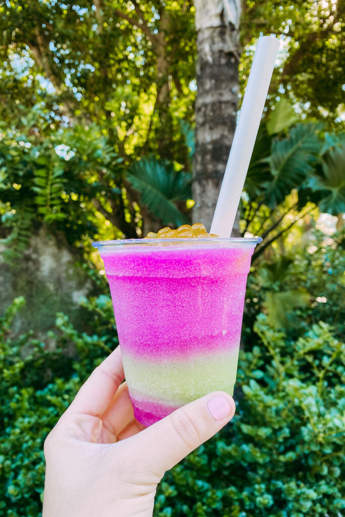 After Flight of Passage, we grabbed breakfast at Pongu Pongu. I got the breakfast sandwich and Melissa (my sister) got the french toast sticks and we both got the Night Blossom drink. Since we were in Pandora, we rode the Na’vi River Journey (G+).