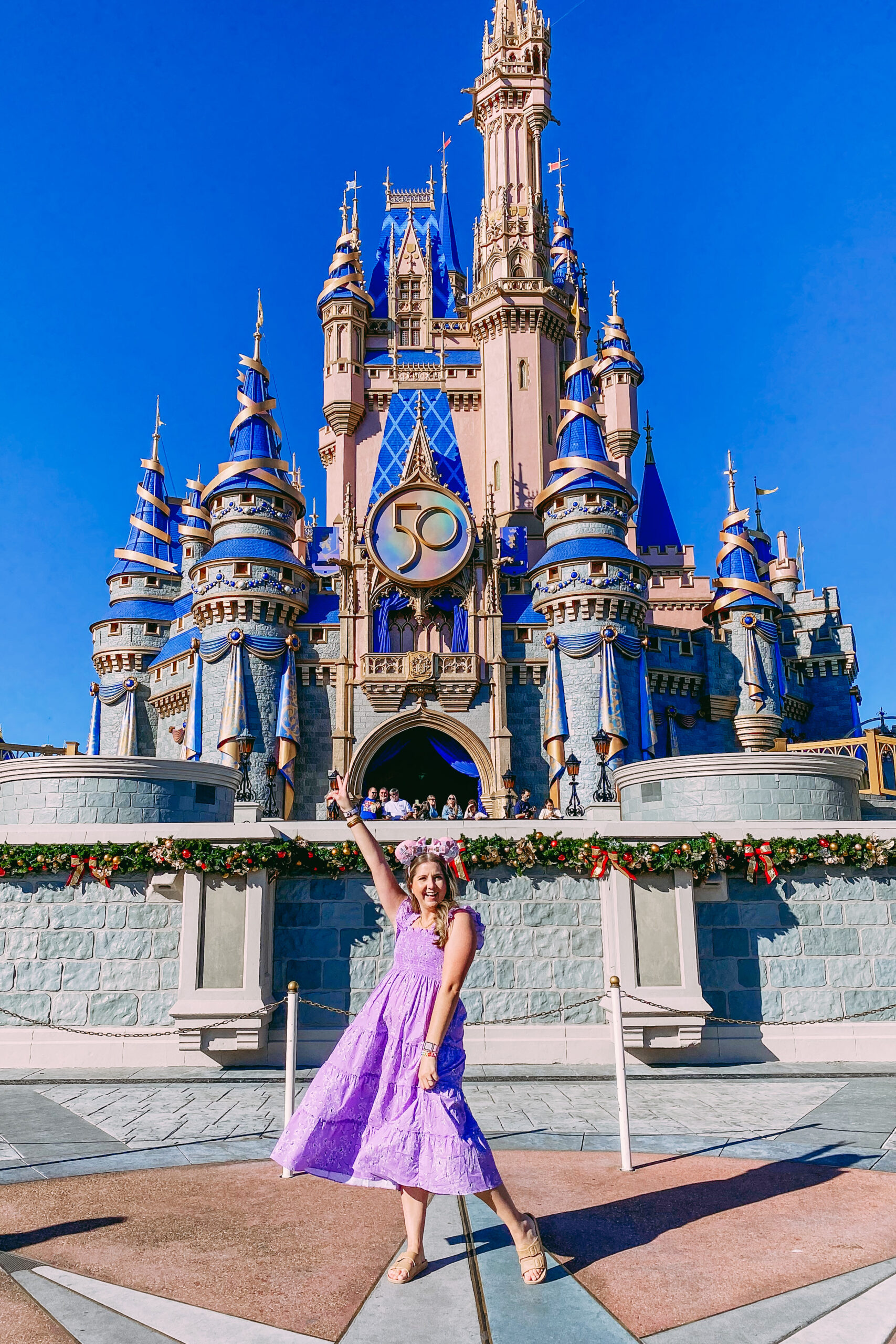 From there we took the bus back to our hotel and freshened up a little bit to go to Magic Kingdom. We headed to Magic Kingdom to take pictures in front of the 50th-anniversary castle. We didn’t plan to spend a lot of time here because we bought tickets to the Very Merriest After Hours which we planned to get all the rides in, however, since it would be dark we wanted to get the classic castle photo.