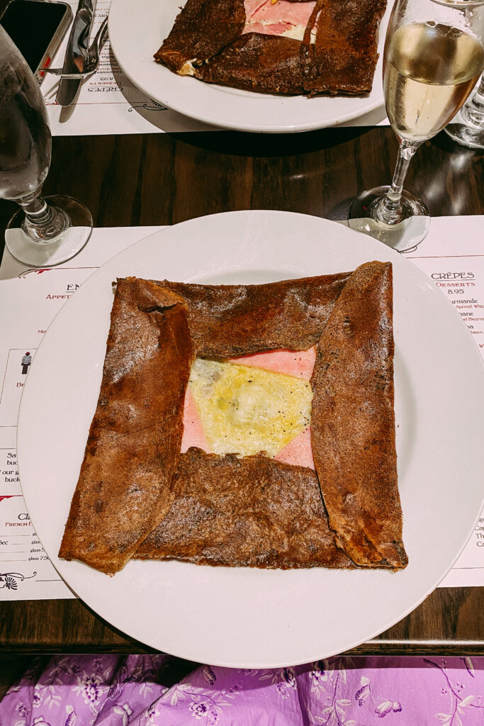 Once we arrived at Epcot, we had a little bit of time before our Ratatouille reservation so we hopped on Finding Nemo (G+) and Soarin’ (G+) then walked over to France. Ratatouille was honestly so much better than I expected. It’s so cute and reminds of Minnie and Mickey’s Runaway Railway! From there I wanted to get a crepe for dinner. There was a walk-up window or you can sit down at La Crêperie de Paris. There was no wait and the cast member at the door was basically begging people to come inside. I am SO glad I asked what the difference is, because it looked too good to be true but I think they aren’t doing dining reservations just yet because they just opened so I think people just didn’t realize you could go right in. Melissa and I both got the Classique crepe and I got a glass of champagne…because when in France!