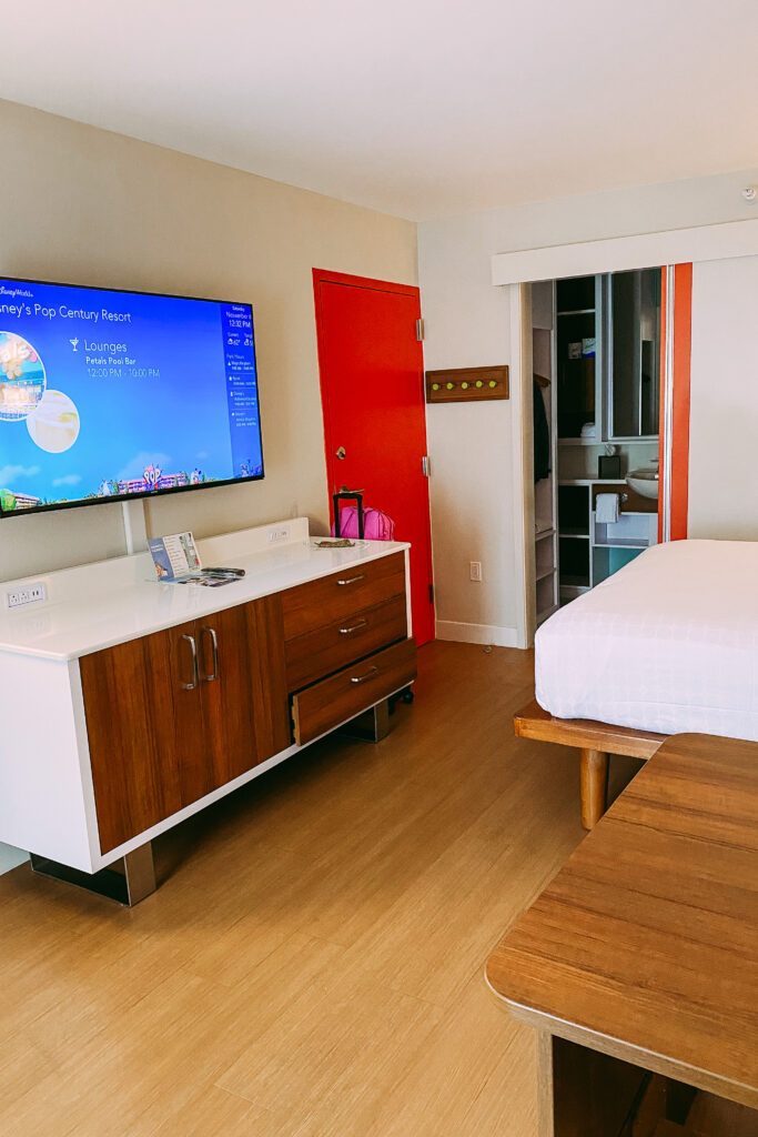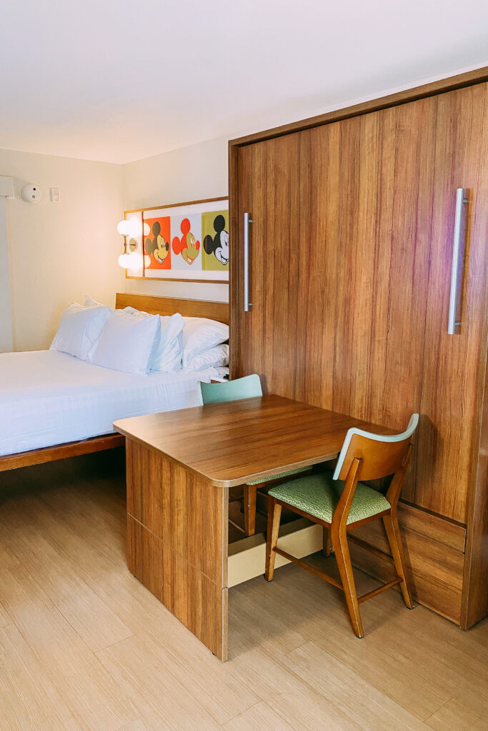 We stayed at Pop Century resort, which is like the cheapest of the cheap for all Disney resorts. In my opinion, we only sleep there so we don’t need it to be fancy. These rooms are small and great for 2-3 people, but anything more is a tight squeeze. There’s typically one queen bed with a murphy bed that folds down.