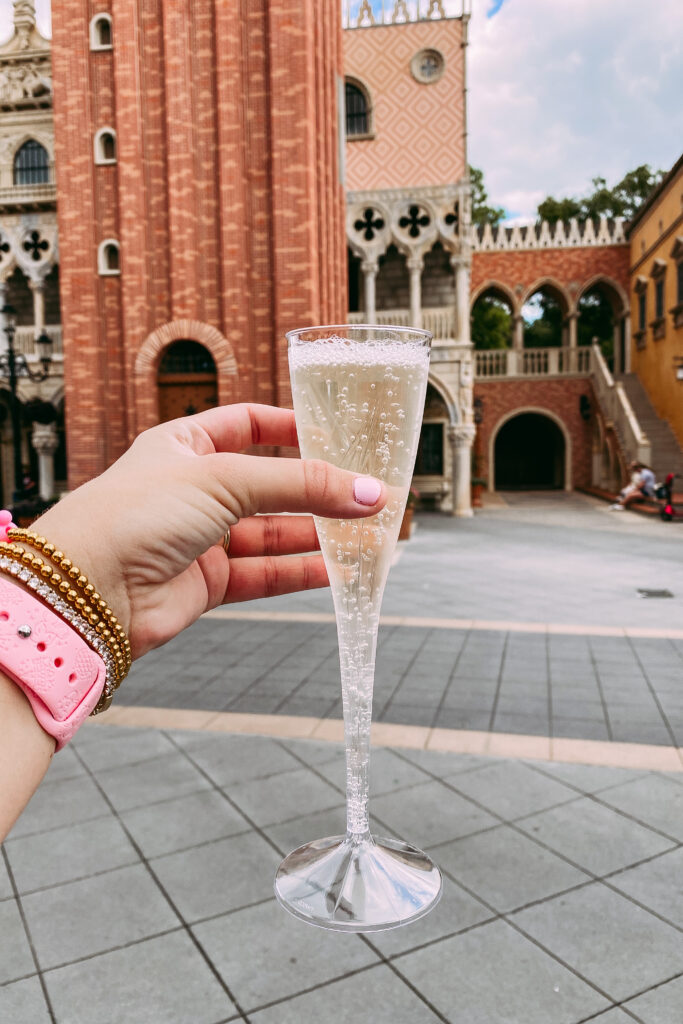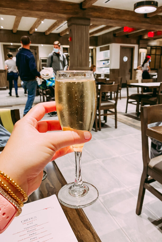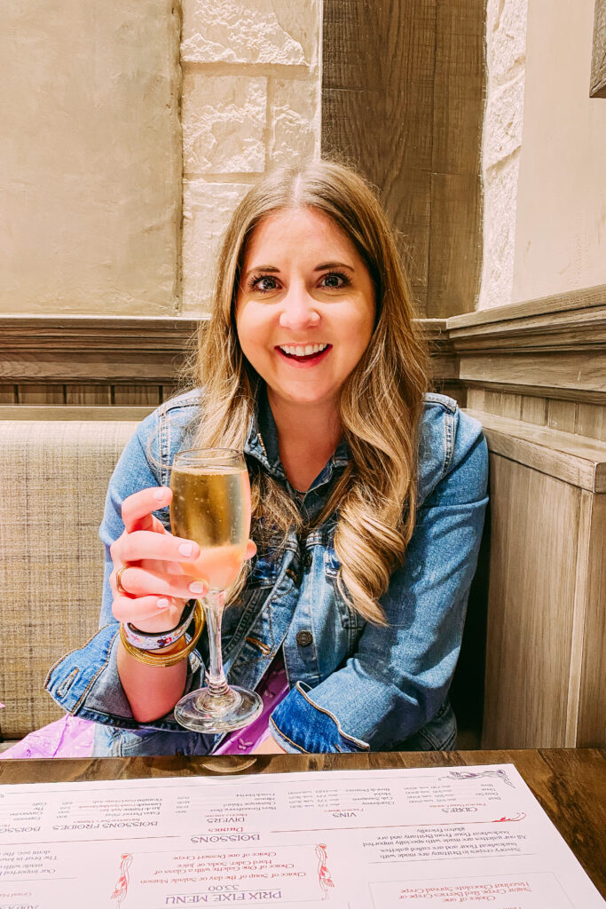 Once we arrived at Epcot, we had a little bit of time before our Ratatouille reservation so we hopped on Finding Nemo (G+) and Soarin’ (G+) then walked over to France. Ratatouille was honestly so much better than I expected. It’s so cute and reminds of Minnie and Mickey’s Runaway Railway! From there I wanted to get a crepe for dinner. There was a walk-up window or you can sit down at La Crêperie de Paris. There was no wait and the cast member at the door was basically begging people to come inside. I am SO glad I asked what the difference is, because it looked too good to be true but I think they aren’t doing dining reservations just yet because they just opened so I think people just didn’t realize you could go right in. Melissa and I both got the Classique crepe and I got a glass of champagne…because when in France!
