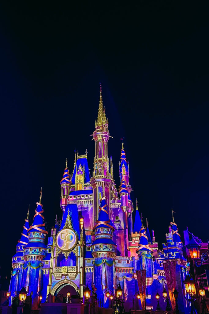 From there we took the bus back to our hotel and freshened up a little bit to go to Magic Kingdom. We headed to Magic Kingdom to take pictures in front of the 50th-anniversary castle. We didn’t plan to spend a lot of time here because we bought tickets to the Very Merriest After Hours which we planned to get all the rides in, however, since it would be dark we wanted to get the classic castle photo.