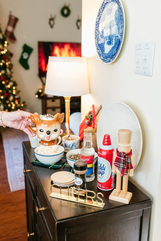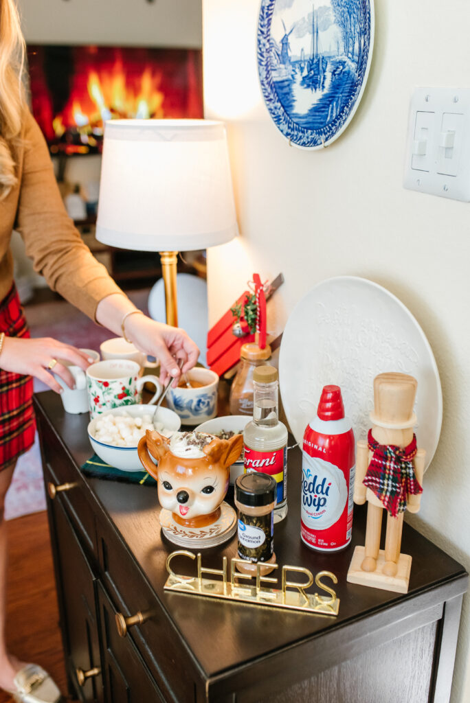 It also helps to designate a specific space that can be set up the whole time or weekend. I used this little cabinet off our kitchen and cleared everything off to give the hot cocoa bar its own space while not in the way of cooking happening in the kitchen.