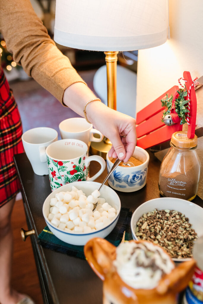 The key to making a festive hot cocoa bar is all about presentation. I recommend taking all of the items out of their original packaging and putting them in serving dishes.