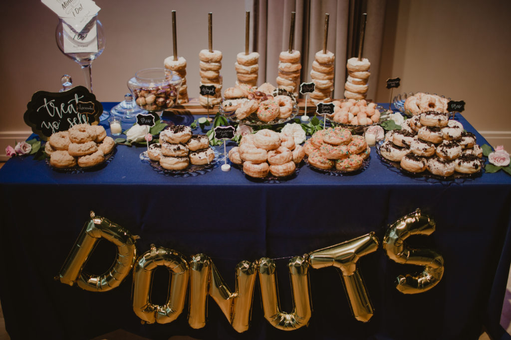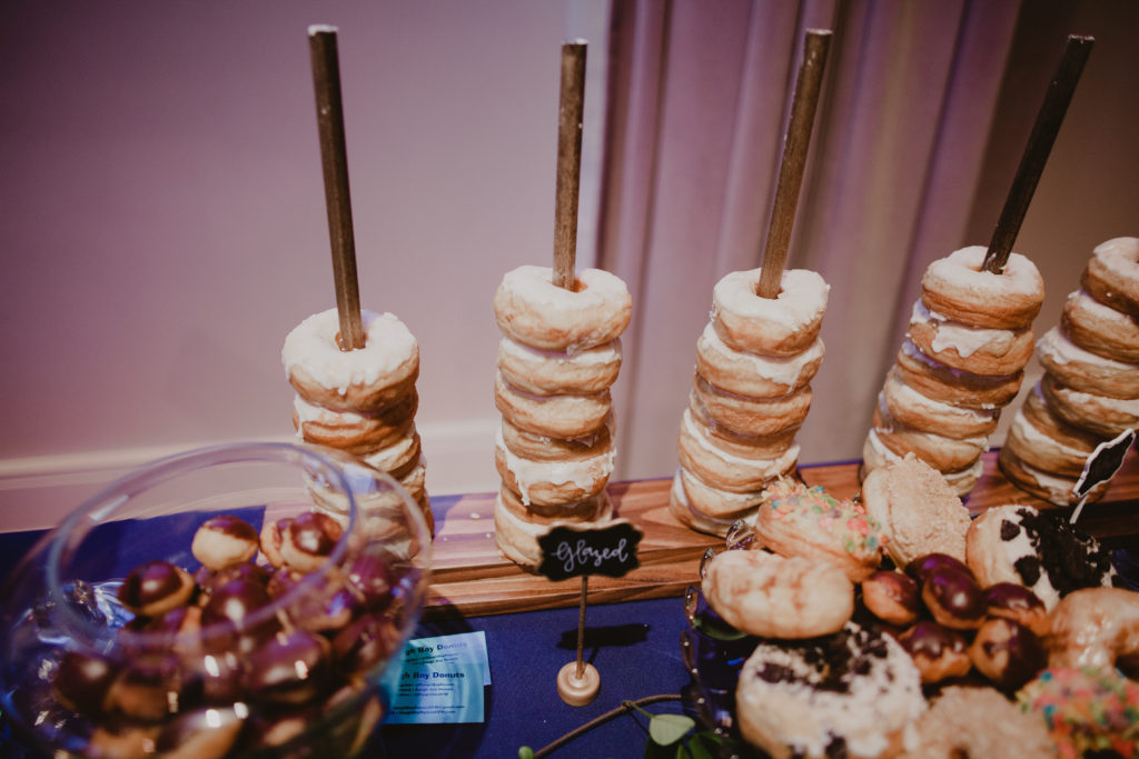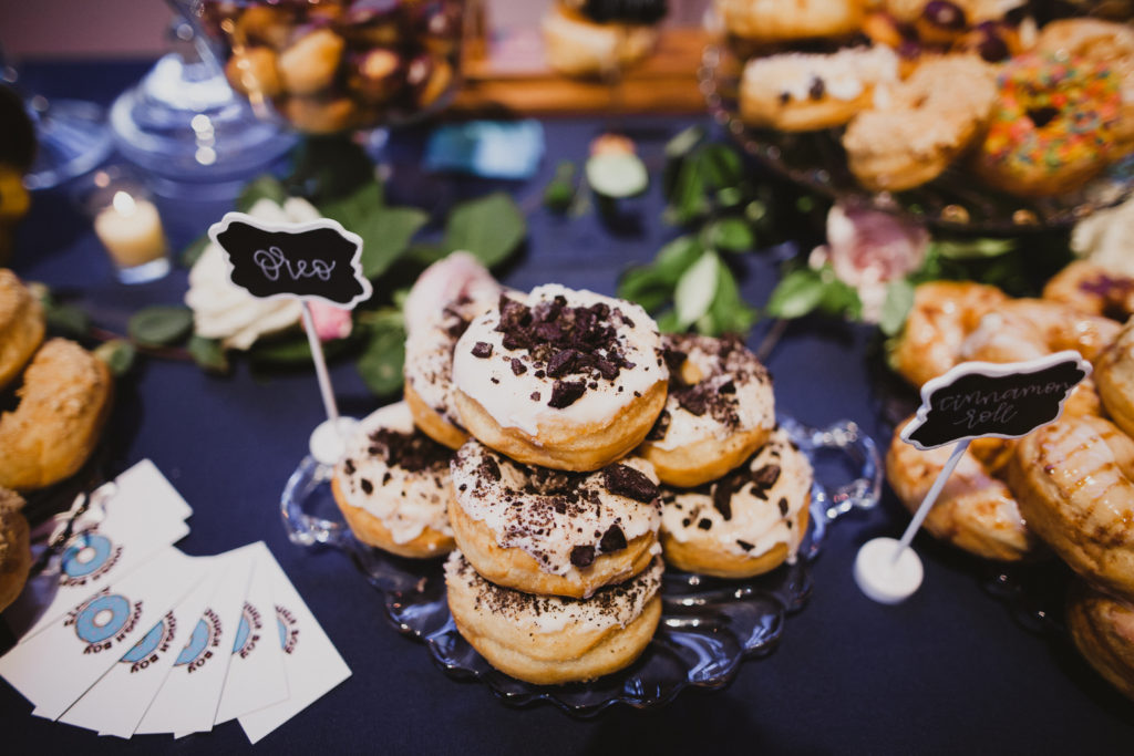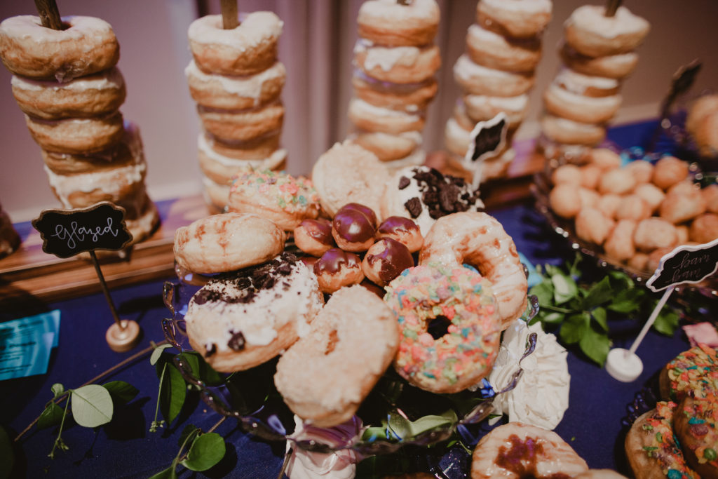 Like I mentioned in our post about non-traditional wedding cake ideas, we aren’t cake people, so for Jared’s groom’s cake, we opted for a donut bar wedding. Jared LOVES donuts and this was a unique way to showcase his personality and honestly it was a hit! People were immediately standing in line and the whole bar was licked clean! We had every flavor from Oreo to fruity pebbles to cinnamon roll.