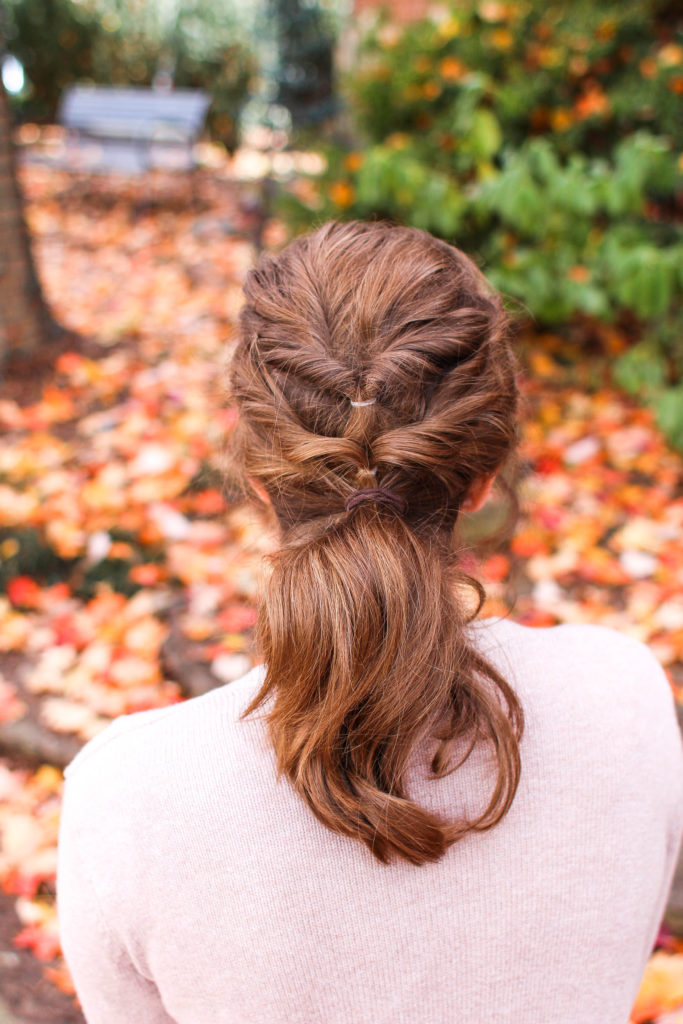 5. Once you get to a good stopping point tie off the rest of the hair in a ponytail and loosen some pieces of hair around your face for a more tousled look.
