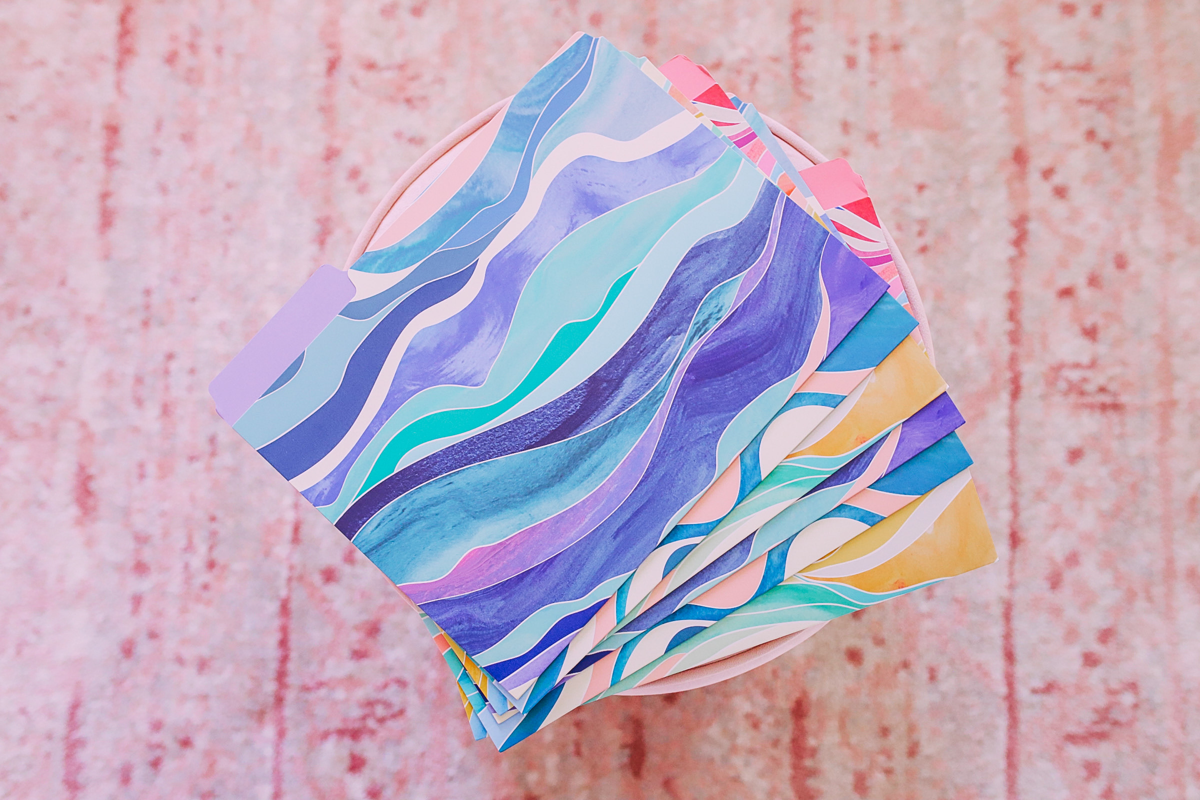 These fun file folders come in a pack of 6 with a sheet of labels. The inside is solid, so you could reverse them if you wanted to switch it up.