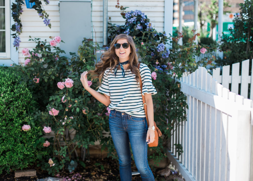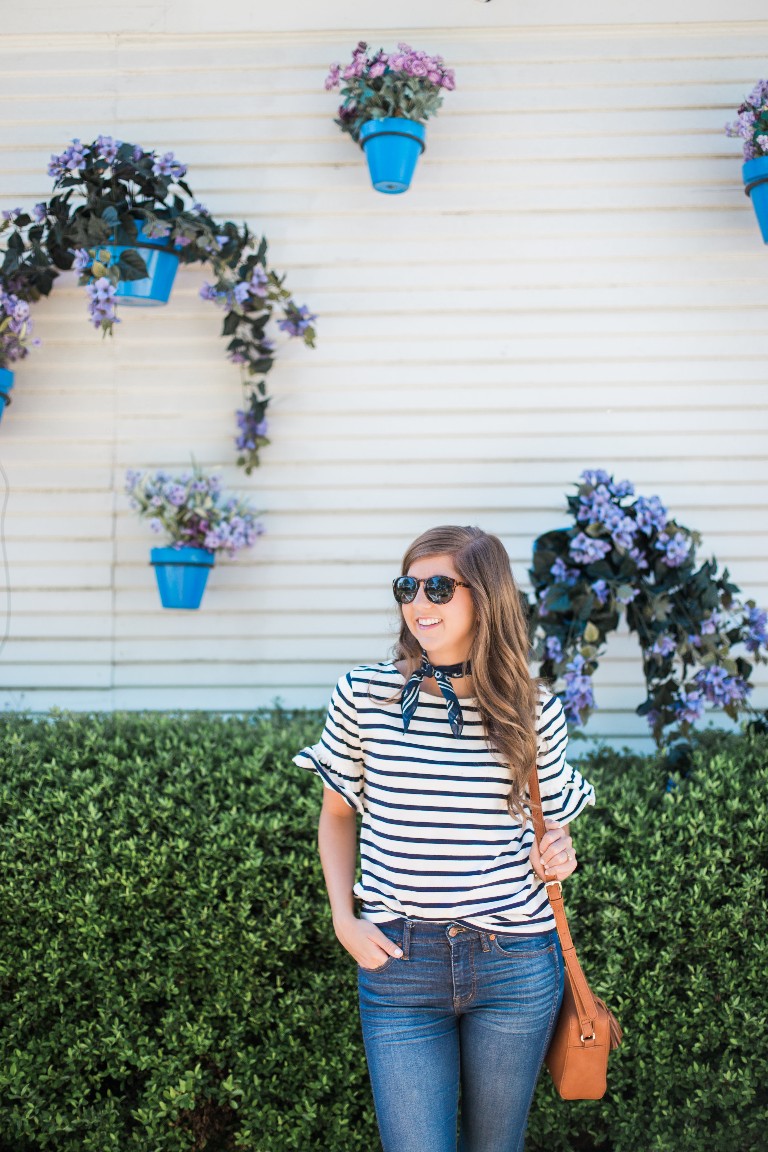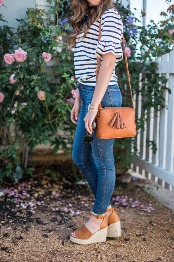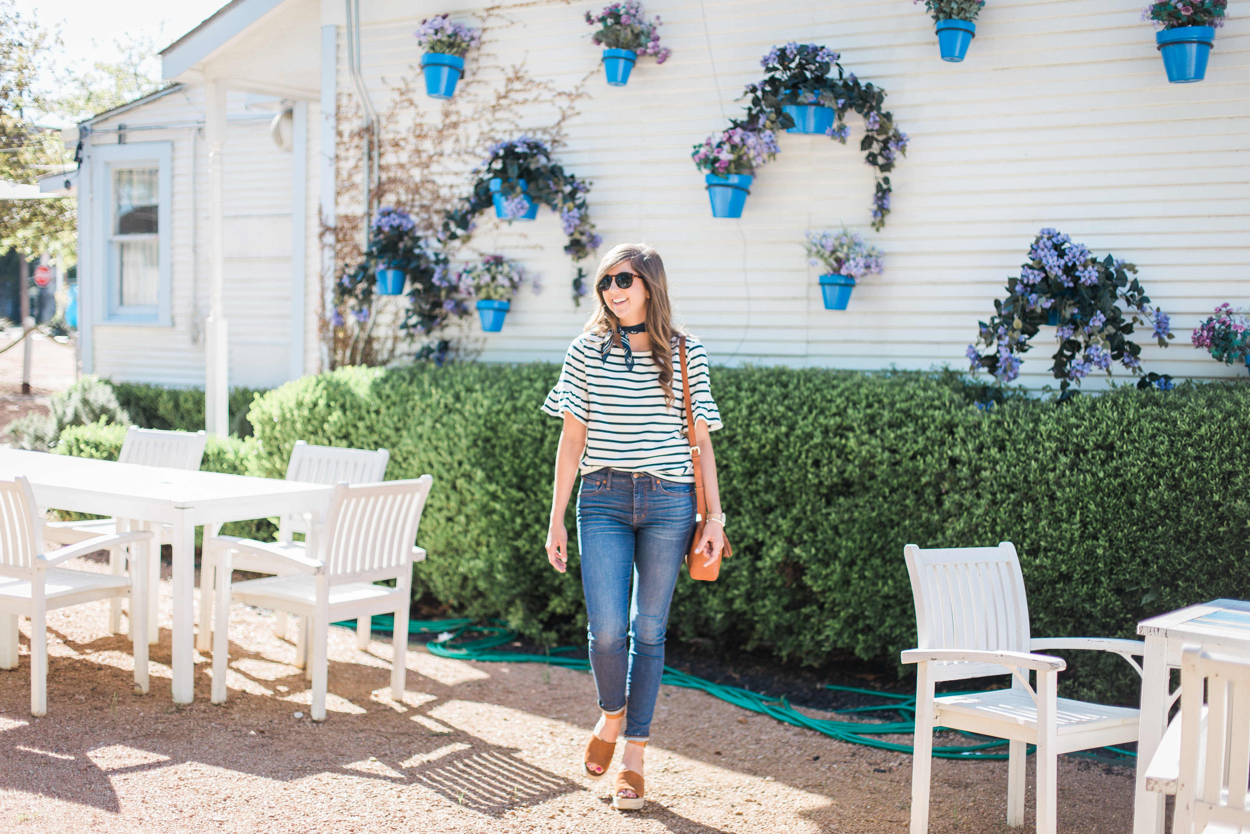 I am currently wearing this striped ruffle sleeve top while writing this blog from the Philadelphia airport and I paired the same top and jeans with sneakers and pulled my hair in a ponytail. I had my eye on a similar version of this top from J.Crew last season but just couldn’t justify the price, so when I came across a less expensive alternative I added it to my cart immediately.