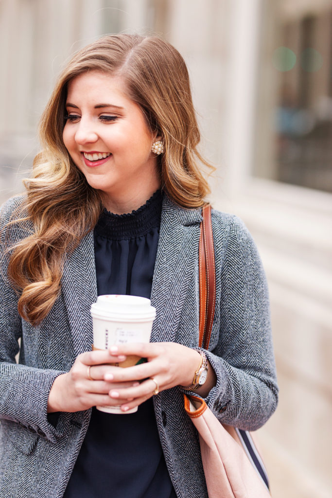 I love this blazer because of the navy herringbone pattern and I love the price even more. I found this gem on the clearance rack for about $40. Total score!