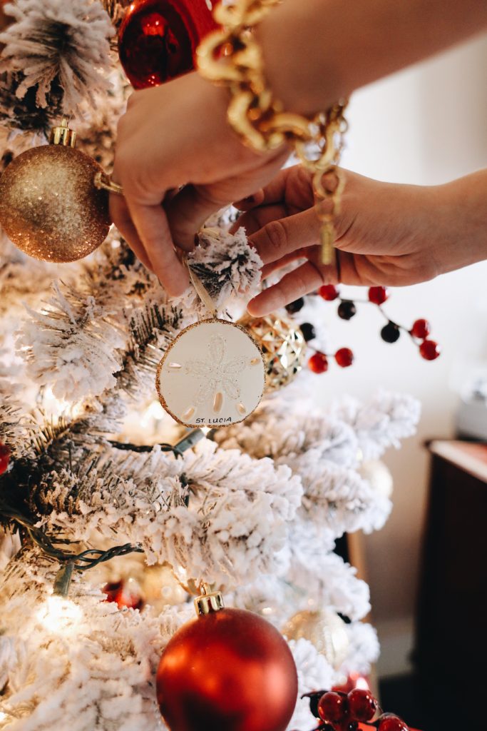 One of the traditions we have started since getting married is collecting different Christmas tree ornaments for the different places we travel together. Our first ornament was this sand dollar one from our Honeymoon in St.Lucia. Now that we have a color scheme and theme, it will be much easier to choose ornaments on future vacations.