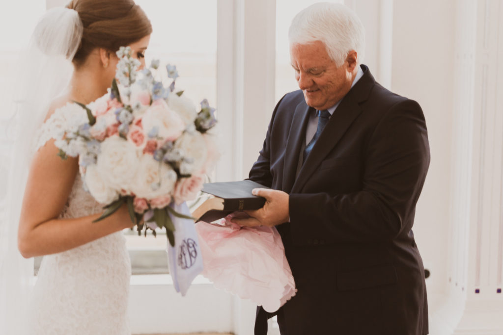 Growing up the daughter of a pastor, I wanted to gift my dad with a nice Bible with a handwritten note. Since he officiated the wedding this seemed like an extra special token of my love for him.