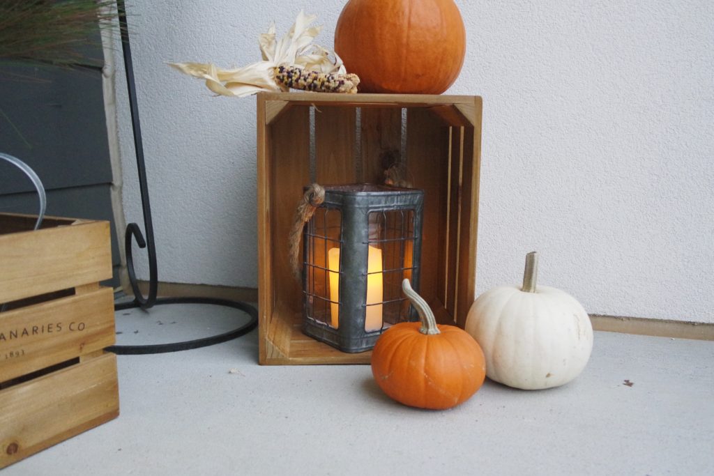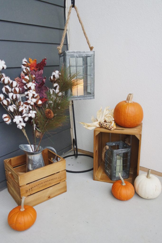 Next, I wanted a cute little decor area in the corner to add some fall style and bump up my patio up to the next level. When styling home decor I am always thinking in layers and levels. So I started with the hanging lantern in the corner for the tallest statement piece. I then layered the watering can inside the wooden crate for more layers. I still need some height so these sprigs of cotton and leaves were perfect. Next, I stood the second crate up vertically and popped the smaller lantern inside for depth. I topped the whole look off with some pumpkins to add color to the overall vibe.