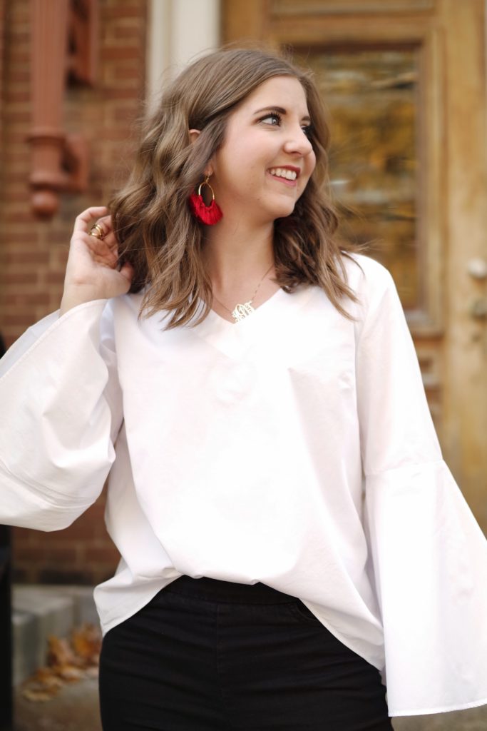 I let the earrings be the star of the show and paired with a white blouse. This top makes a big statement with it’s bell sleeves, but a similar look can also be achieved with a simple white button-down (which is almost exactly what I wore last Christmas Eve – see that look here).