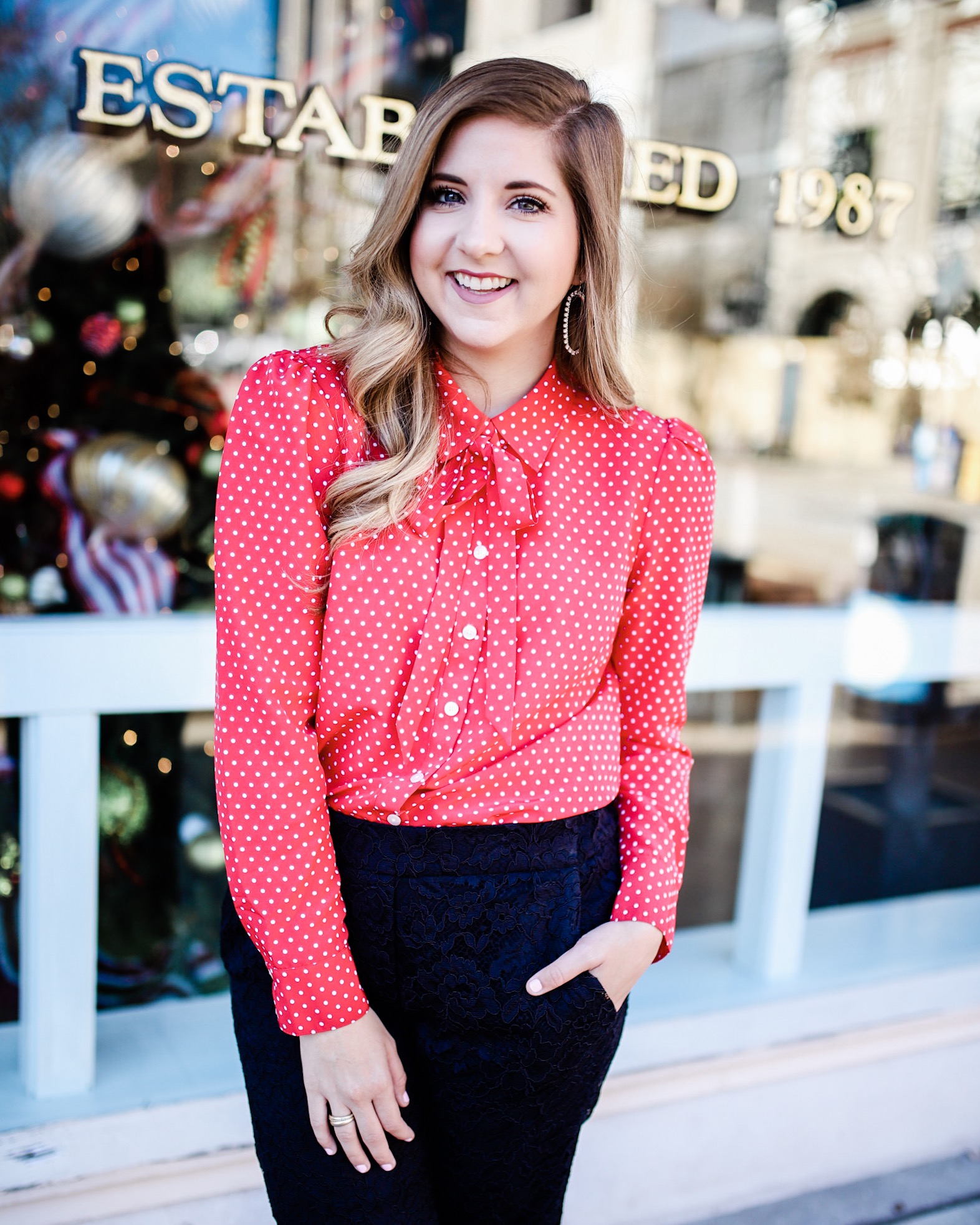 This red and white blouse from Draper James is festive yet perfect for wearing all winter long. It’s not overtly holiday which I love but it is definitely seasonally appropriate. The classic long sleeve button up blouse is nothing new but I love the tie details that adds the extra feminine touch. And Draper James thought of everything because there is a button under the collar to hold the tie in place because there is nothing worse than it getting turned around midday.