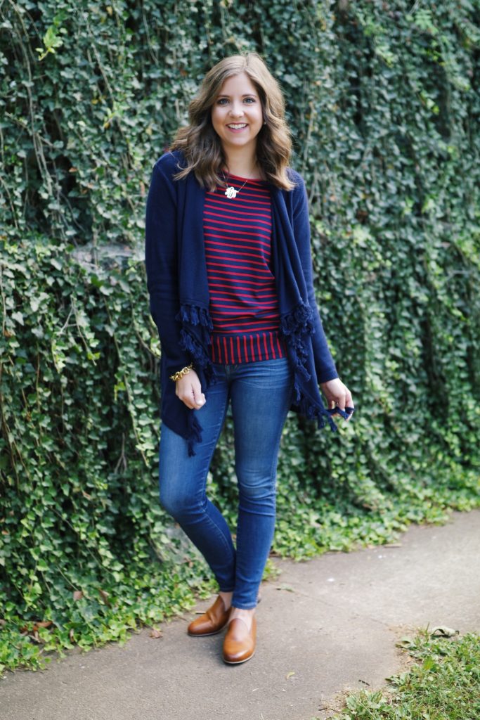 This seems like the obvious choice, but skinny jeans are an easy place to start. I went with a white tee and denim jacket for a cool girl hip look, but I’ve also worn them with a stripe tee and a cardigan in my This or That post with Duffield Lane for a preppier twist.