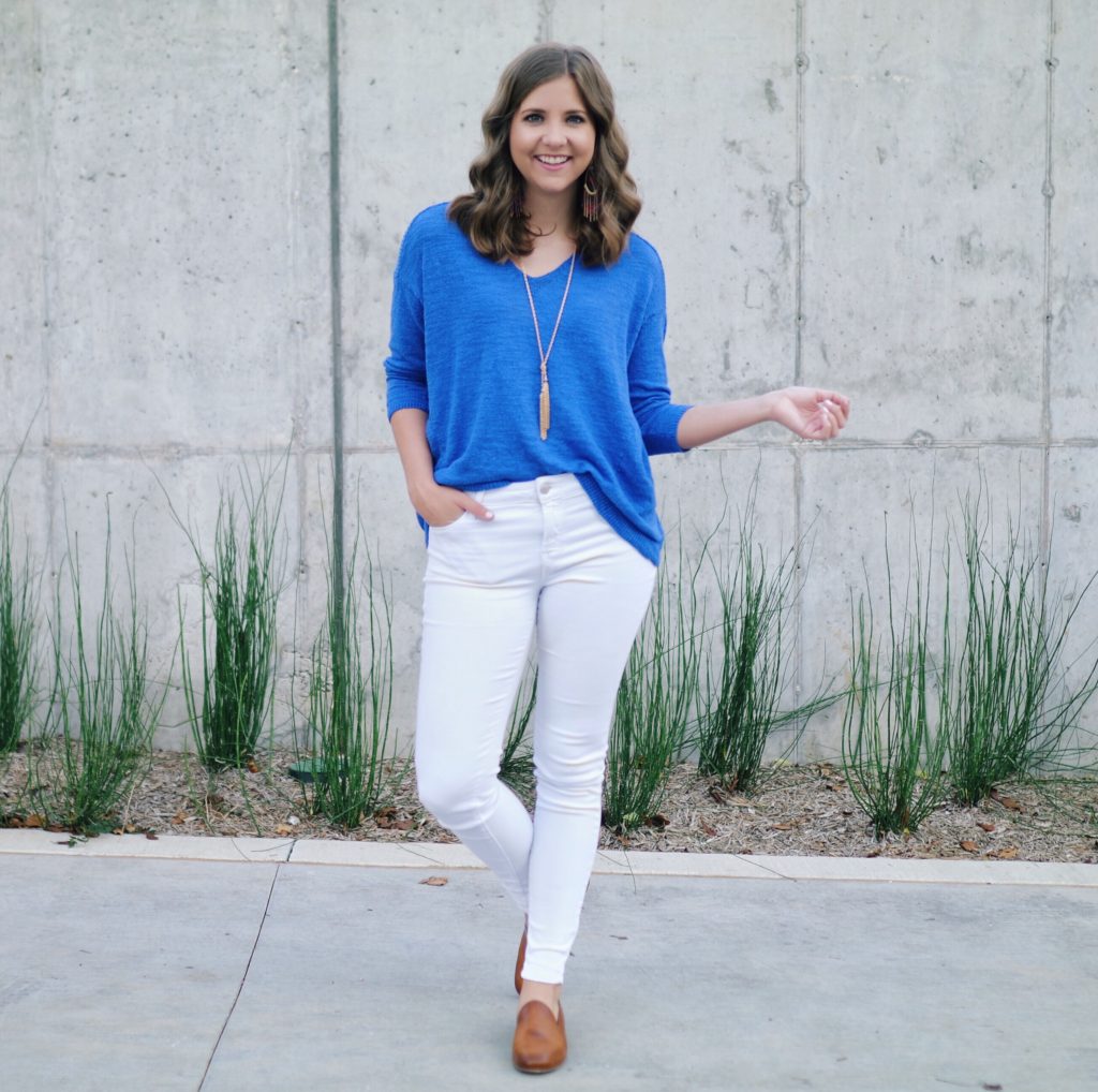 I LOVE the contrast of the rich cognac color with the white jeans. White jeans are summery, but by pairing them with a sweater and a rich fall color, it’s the perfect transition outfit.