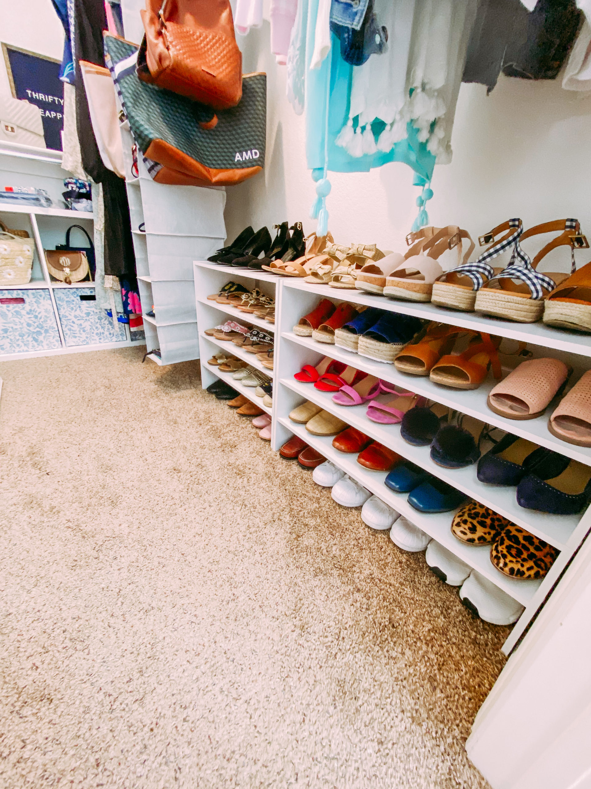 These shoe racks are a lifesaver, we already had three of them so I bought two more from Target and they keep everything so neat and organized but I can still see everything. It feels like all of my shoes are on display which will make it so easy when getting ready. I transferred all of my shoes into this closet so every pair would have a home. I organized them by wedges, heels, loafers, sneakers, etc and then I moved all of my fall/winter boots up on the top shelf since I would be needing them for a while.