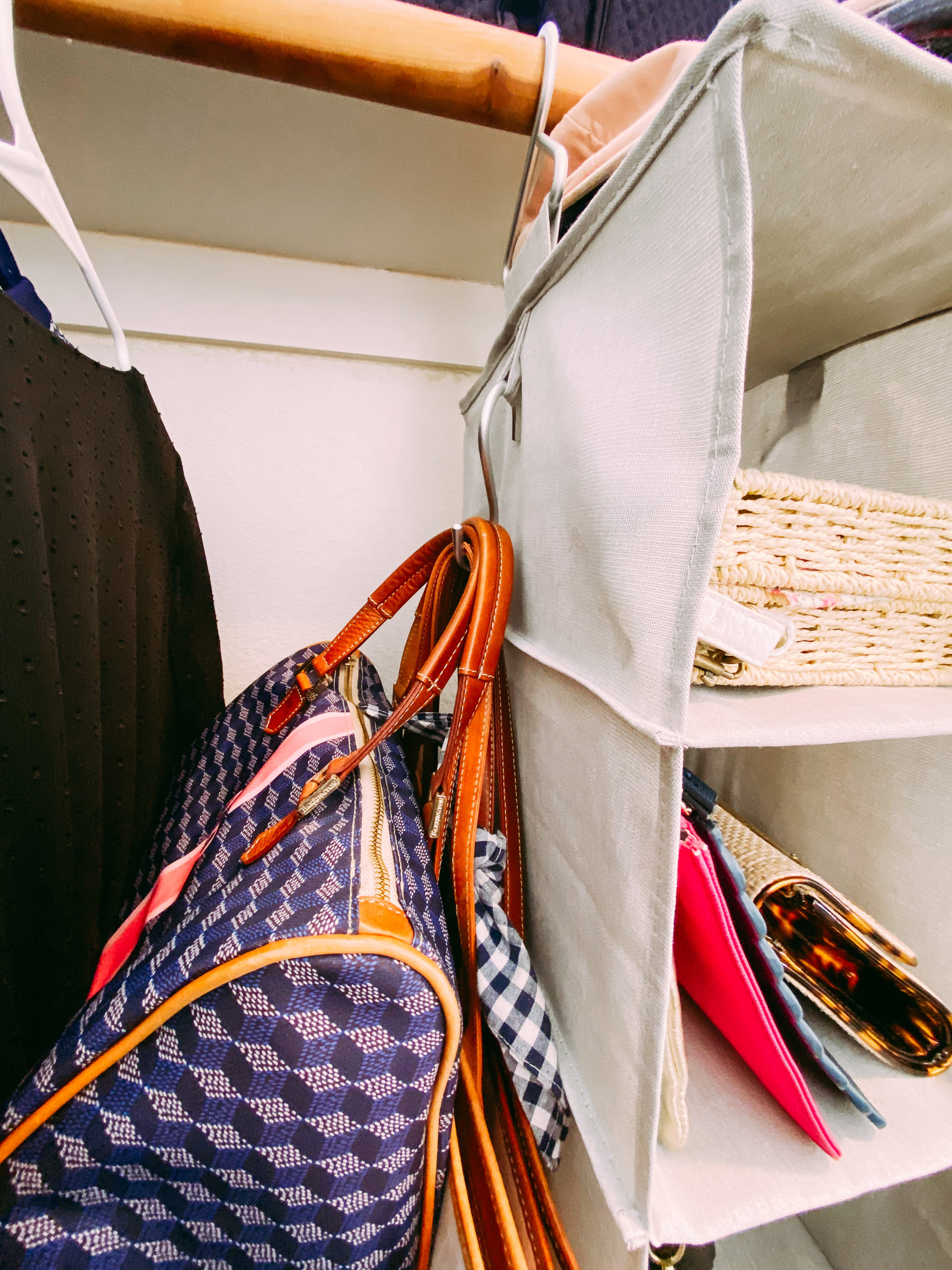 As I was doing some research on Pinterest, I noticed a small purse organizer from The Container Store for $80. For $80, I could buy a new purse lol, so I took the same concept and found a much cheaper alternative. I use a hanging shoe organizer and used each slot to put small crossbody bags and clutches in. I put the ones I reach for the most up top and seasonal clutches down at the bottom. It also came with two S-hooks which were perfect for hanging my larger floppier totes.