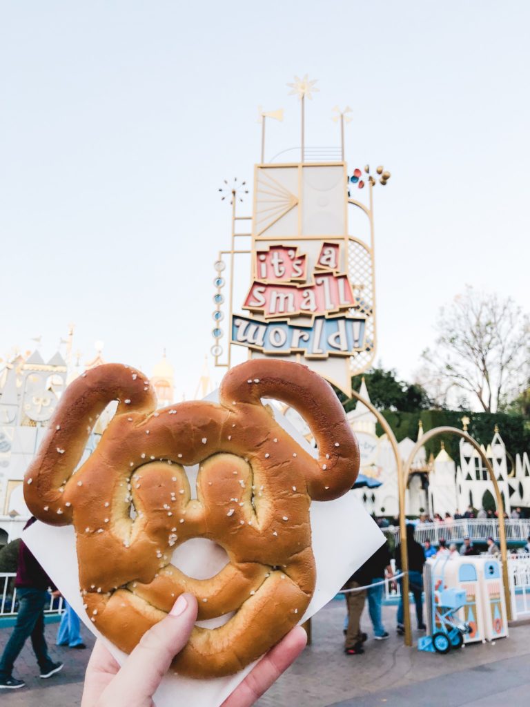 After Soarin’ I decided to head back to Disneyland to grab some souvenirs. I found myself at a Pretzel stand by It’s a Small World and took a seat to enjoy another snack. It was about 5:15 at this point. There was a parade starting at 6 PM, so I needed to decide to stay and wait it out or leave then. Since it was getting pretty dark and I had a long Uber I decided to head out so I didn’t get stuck at the parade, plus my feet were so tired!