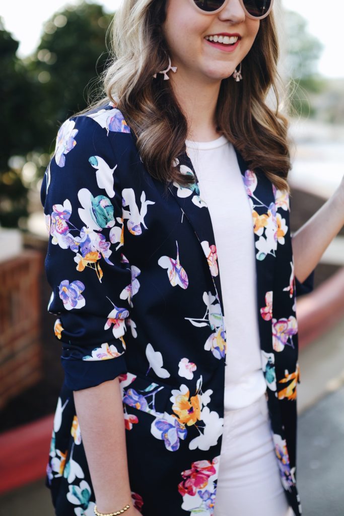 I had been eyeing this floral blazer for weeks, so I decided to finally pull the trigger. It’s not my typical piece I would wear, but styled like I did it seems very classic and preppy. This floral blazer reminds me so much of something Kate Spade would come out with, however, it was not the Kate Spade price tag. (it’s actually on sale for even cheaper than I initially paid. Shop it here!)