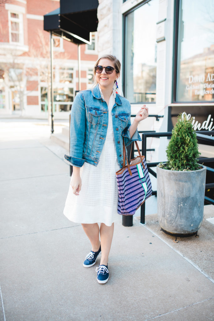 For the day look, I dressed down this white eyelet dress for a casual style. I opted for some basic navy Keds because I love how Keds are low on the foot so they still elongate your legs and don’t cut you off at your ankle.