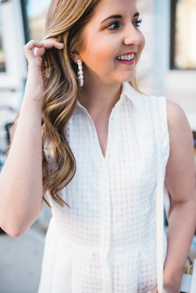 Since it’s Spring, I grabbed a straw crossbody bag with white details to be complimentary and topped the whole look off with a pearl hoop earring. I kept the jewelry minimum to really let the dress shine and give it more of an effortless style.