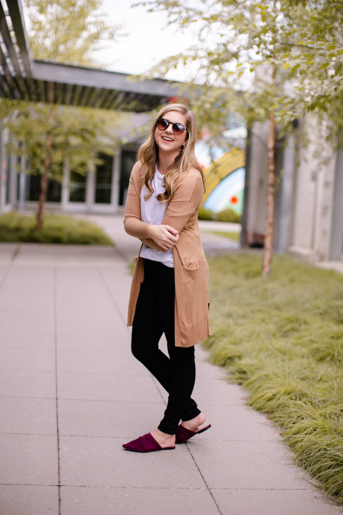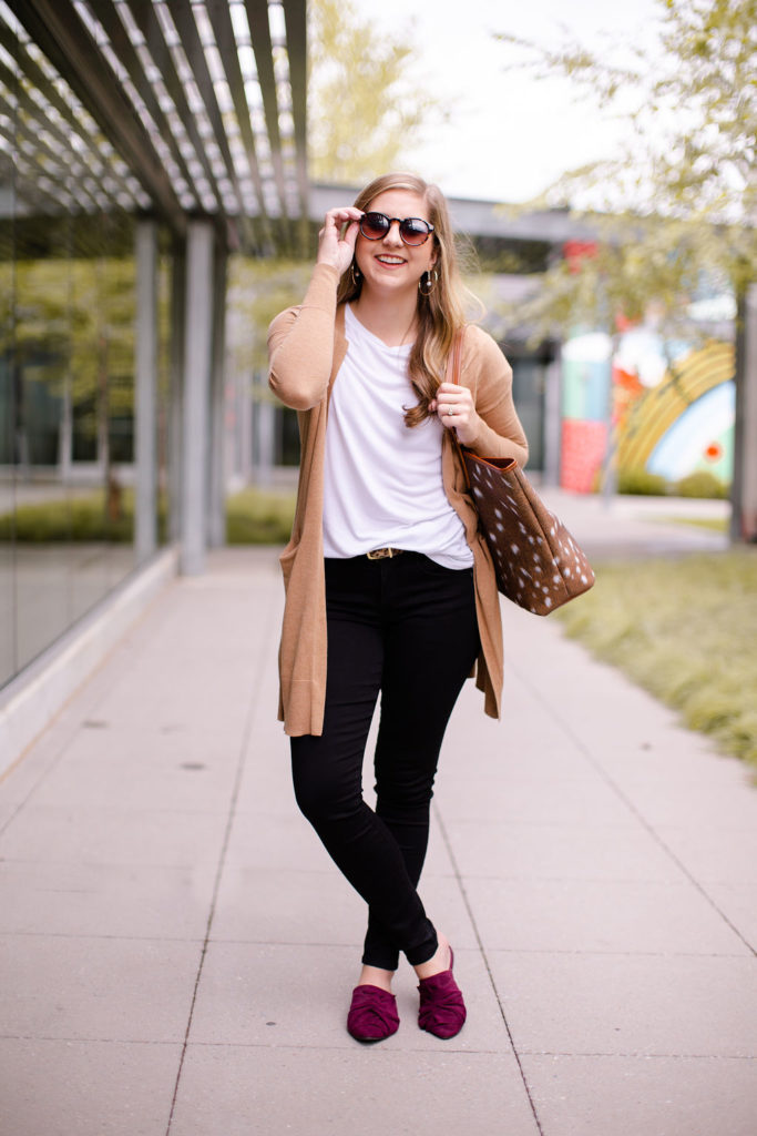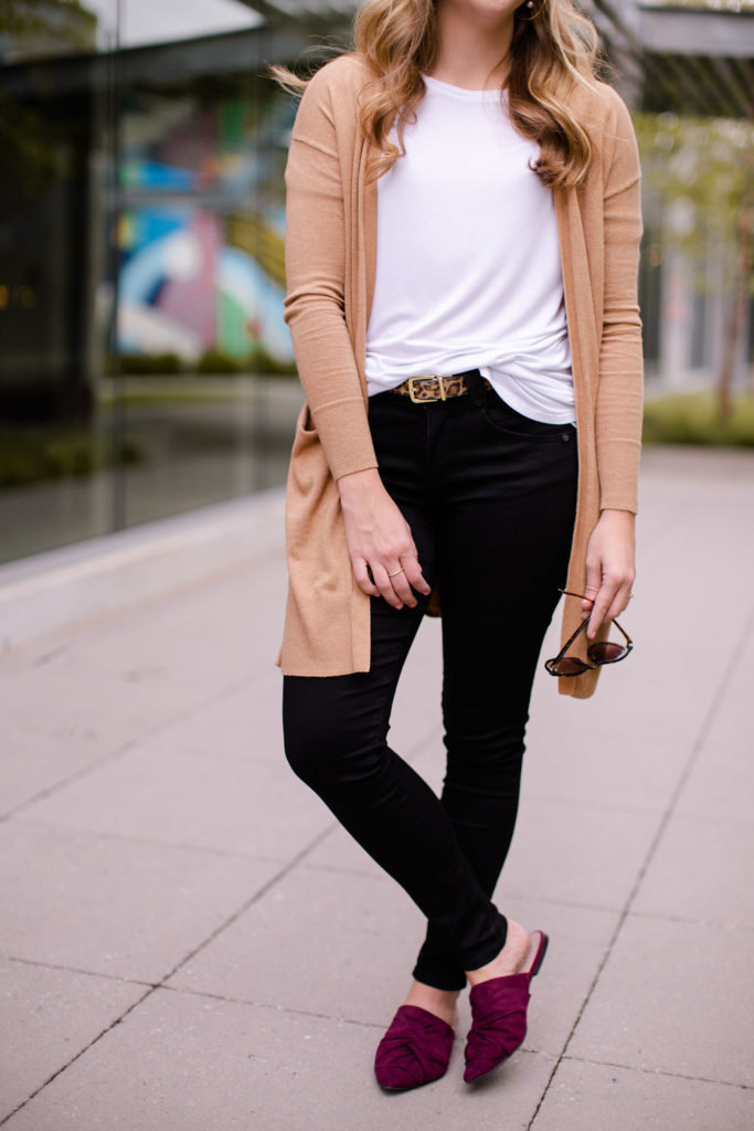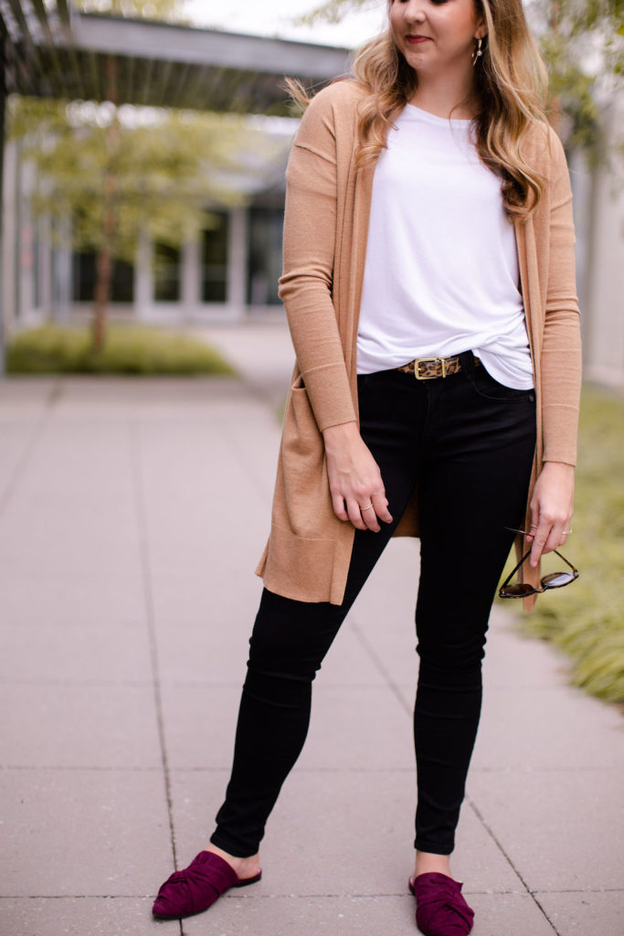 When styled correctly they can fit into any outfit no matter what your style is. I paired this pair of black jeans from Democracy Denim with a basic white tee, a camel cardigan and pop of color with maroon mules. It’s a very simple traditional look but feels a little more trendy and modern because of the black jeans.