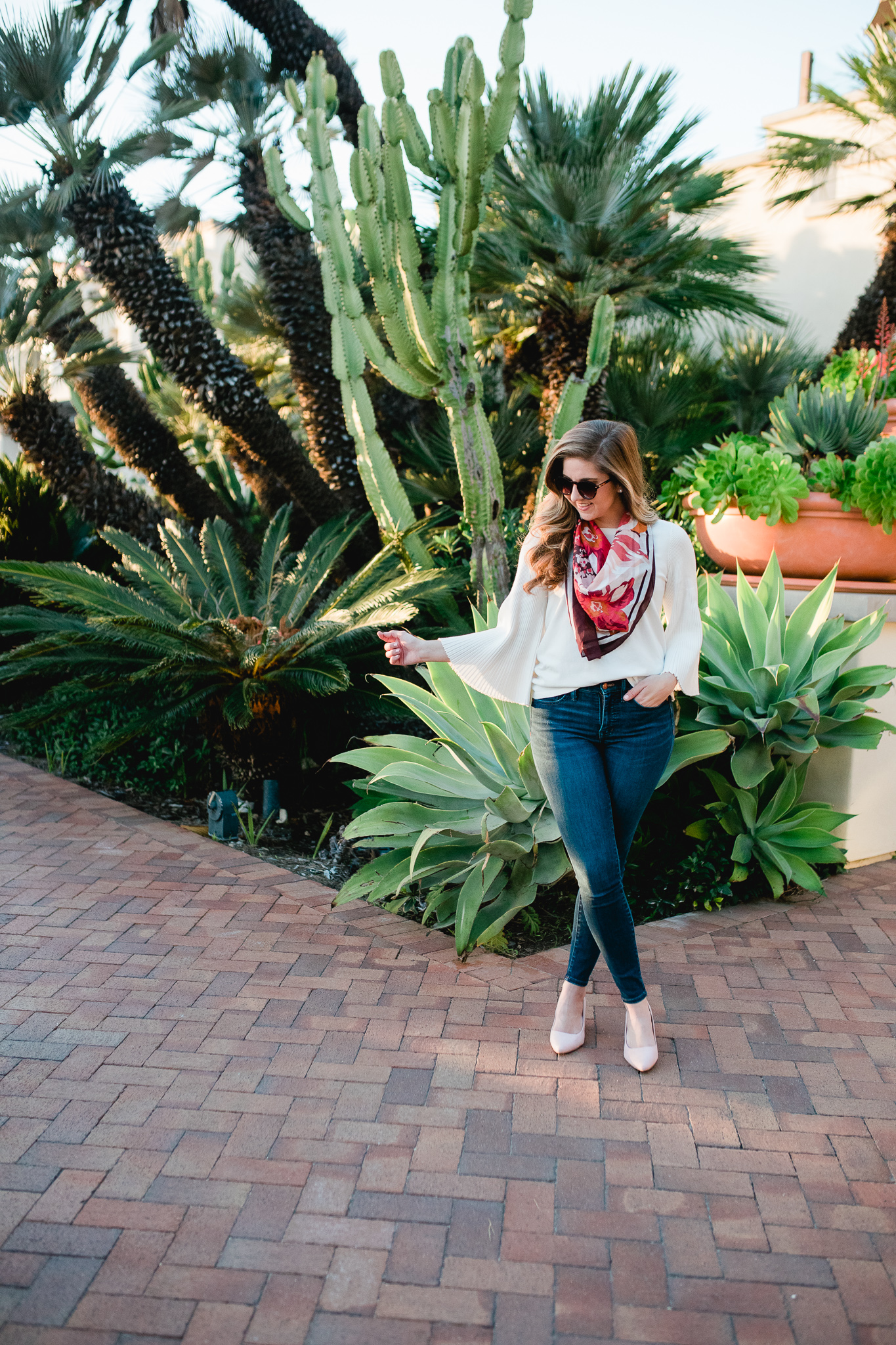 White Pleated Flare Sleeve Sweater | Floral Scarf | Dark Wash Skinny Jeans | Pink Suede Block Heels