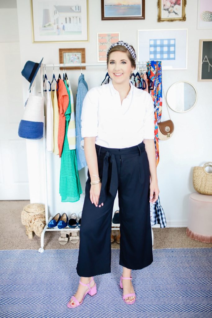 This outfit is so fun because it’s so basic yet still fun and youthful for work. A classic white button down and black trousers, but with a pop of color and gingham headband this look is instantly fun.