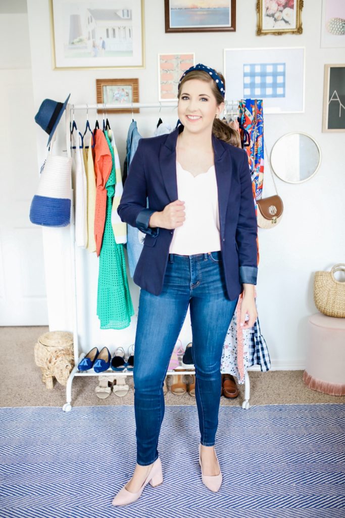 Lastly, without the headband, this would be an every work look for me, but I really love how the navy polka dot headband ties in the navy of the blazer and then the correlating pinks with the cami and shoes. Overall the color scheme is simple and the look is too, but this is a great way to introduce this in your workwear.