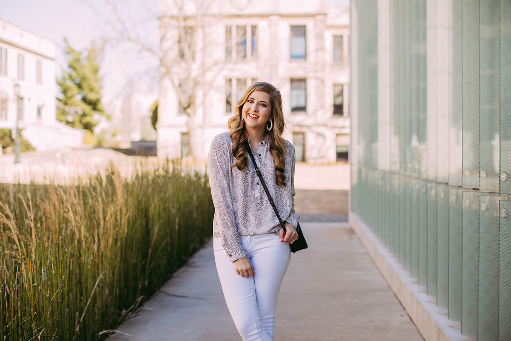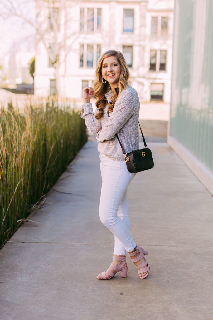 You could definitely pair snake print with black pants and be out the door in no time, but I went for a different approach and went with white jeans. (See The Best White Jeans Under $50 here) This gives the overall look a more airy look and cuts down on the boldness of the print. It also feels more casual and let’s business with this style of blouse.