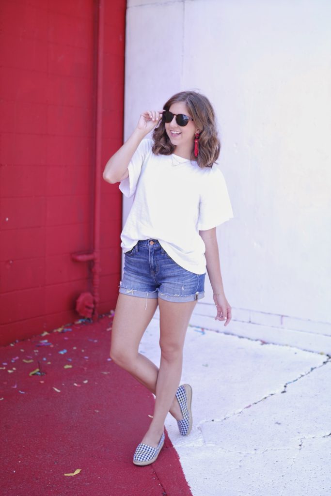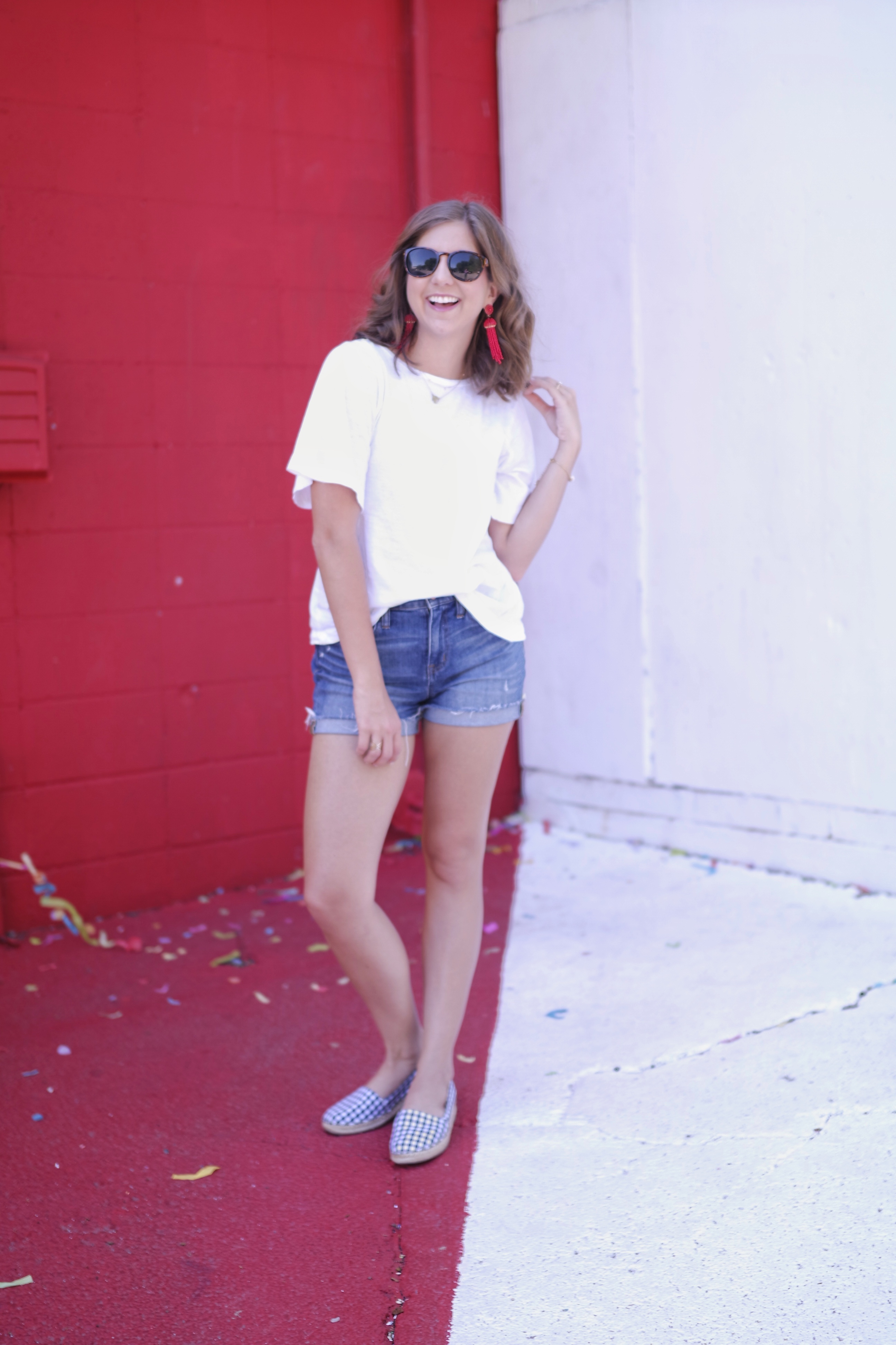 My July 4th will be spent on the road back to Arkansas from Texas. So when I was thinking about what to wear for Independence Day, I picked out a basic white tee, jeans shorts and made the outfit festive with these gingham espadrilles from Target and a red statement earring. Easy Peasy!