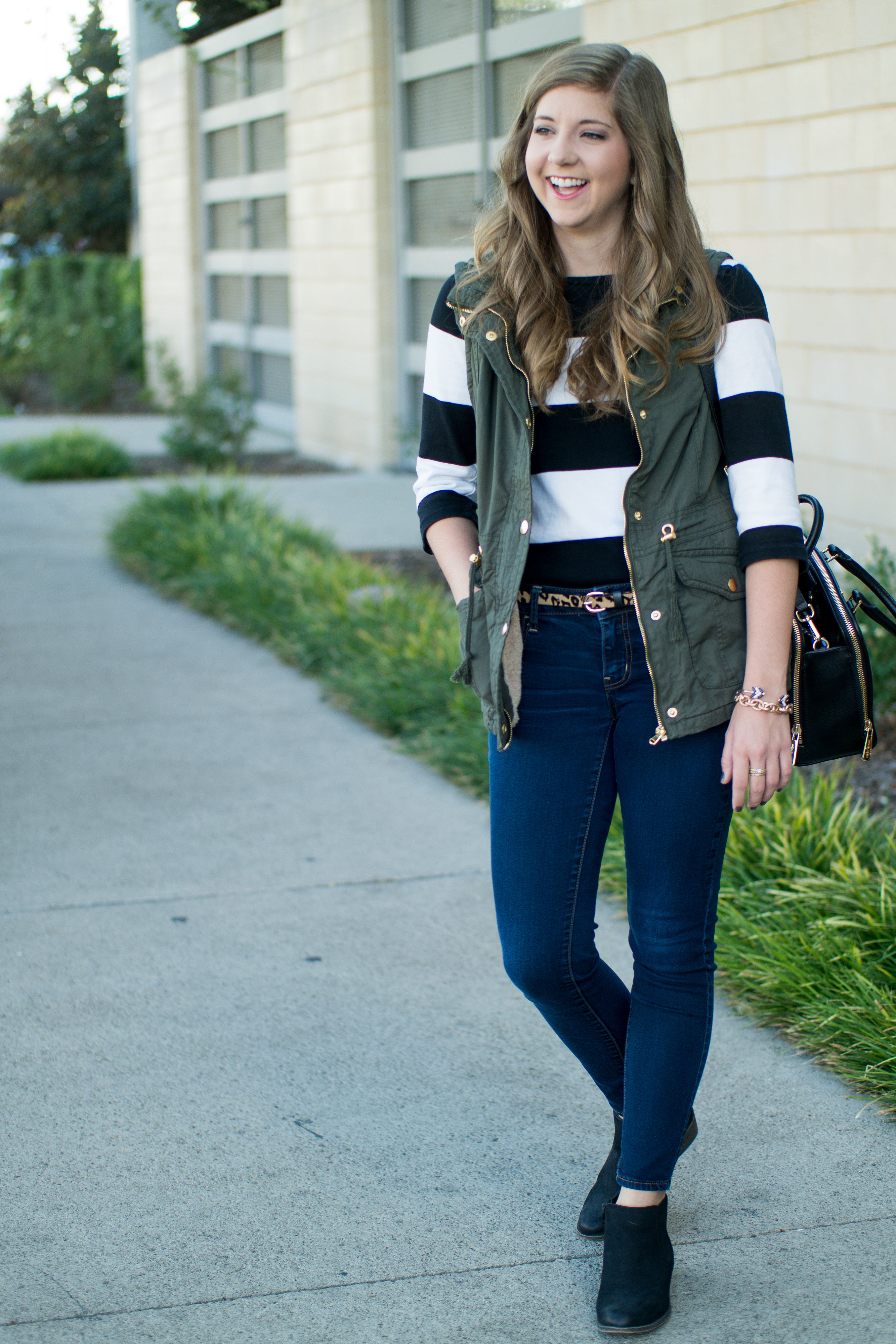 Military Vest | Striped Tee | Skinnies | Cheetah Belt | Booties | Handbag | Bracelet | Earrings