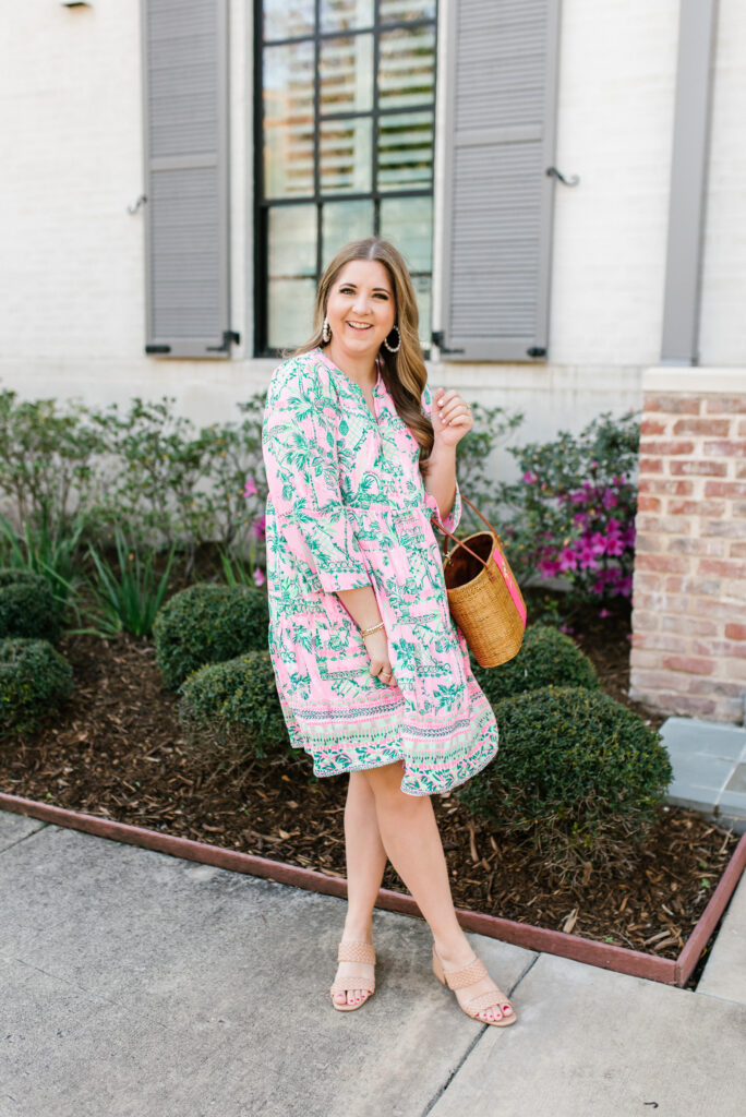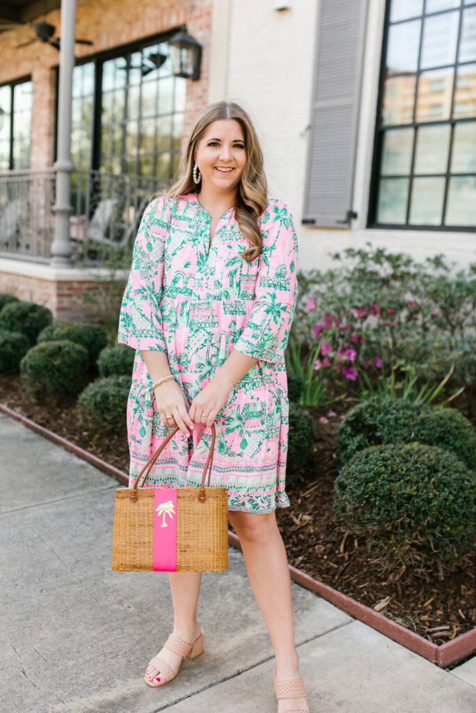 I opted for some nude heeled sandals to elongate my legs and not distract from the print. I also pulled out the hot pink in the print with this rattan and pink tote. The gold palm tree on the tote really pulls the look together.